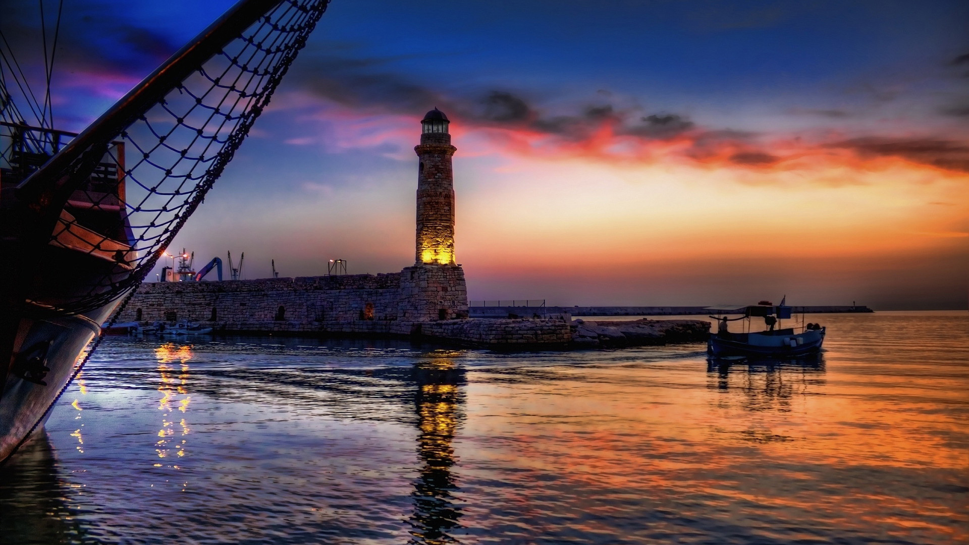 Lighthouse mystical waterboat cityscape dusk - free wallpaper for desktop | 5desktop.com
