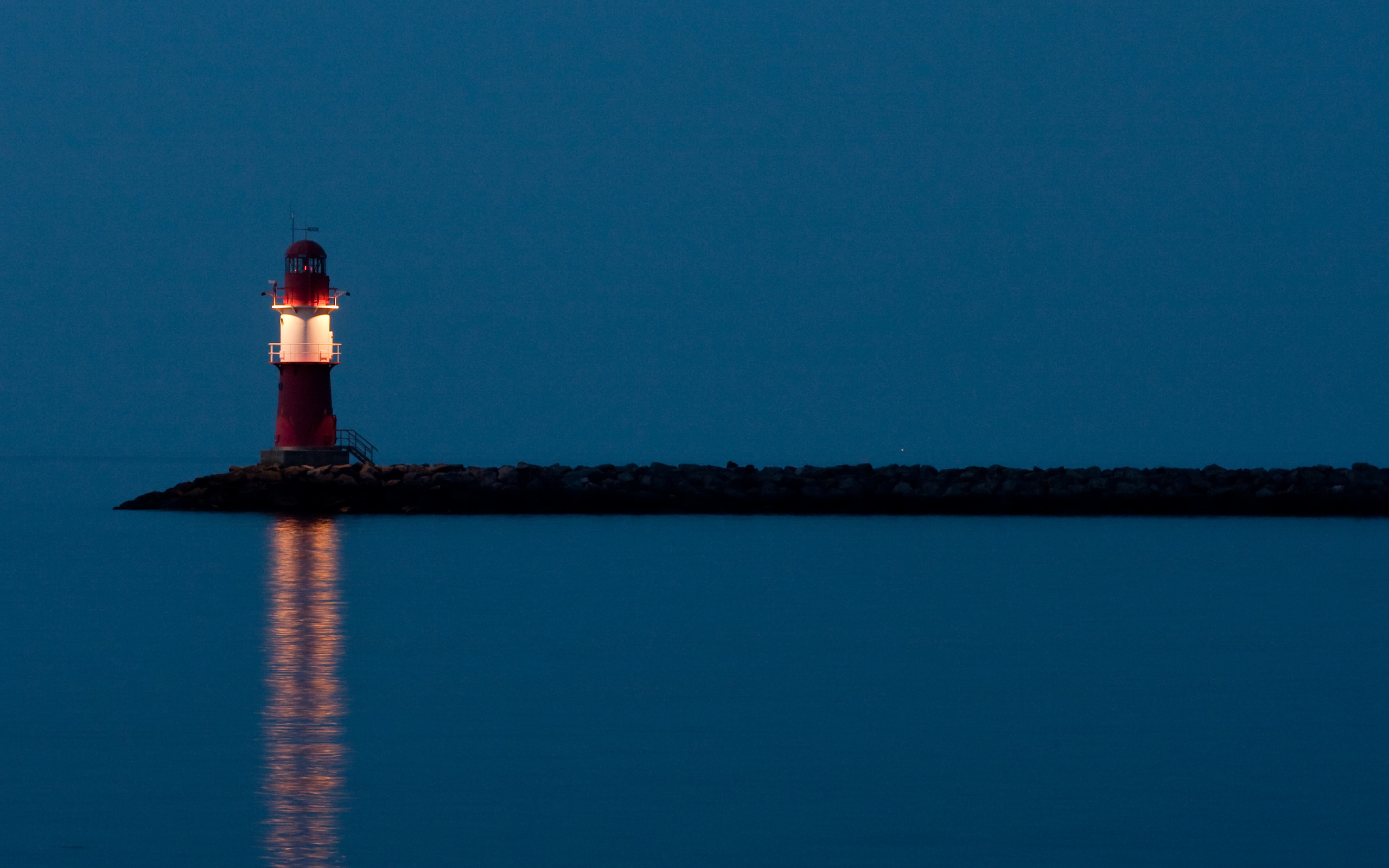 Description: A lighthouse is lit up at night on a small island in the middle of the ocean with a reflection of the light on the water.