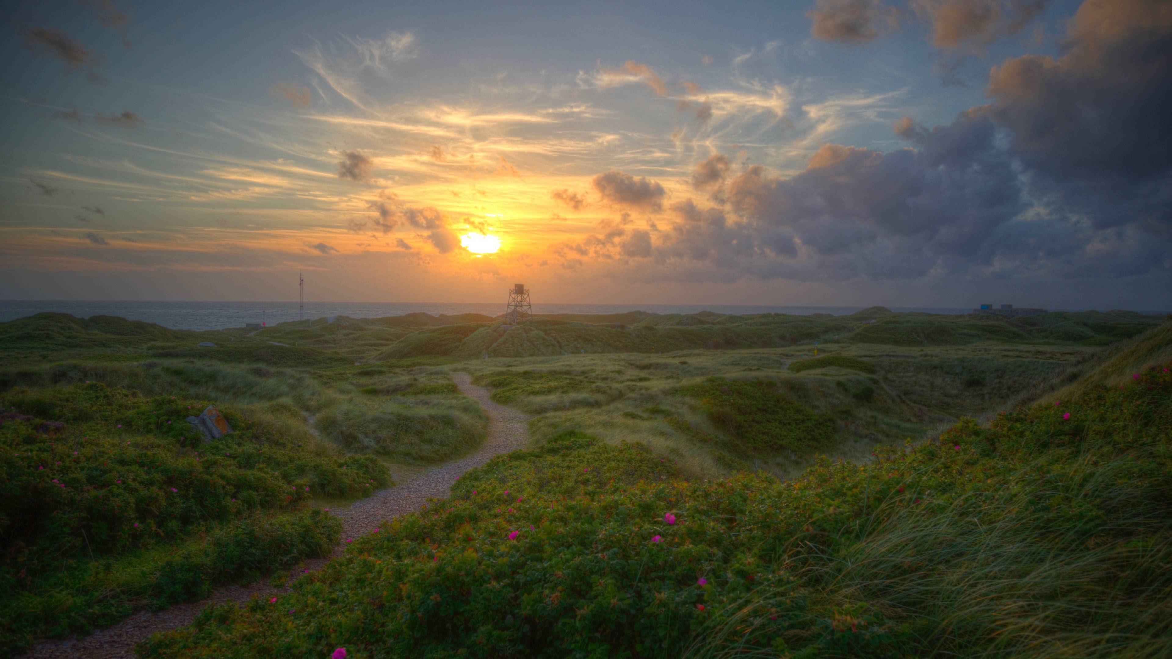 Description: A path leading to a lighthouse on a grassy hill at sunset with clouds in the sky above it and a path leading to a lighthouse on a hill.