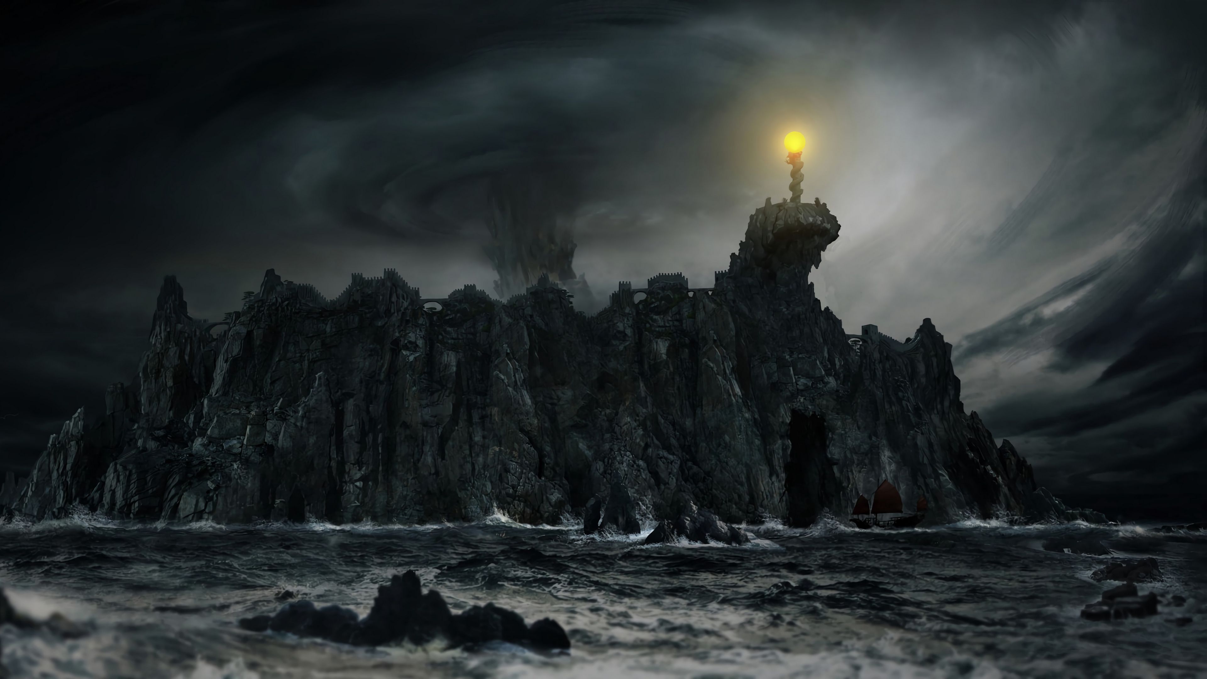 Description: A lighthouse on a rock in the middle of the ocean at night with a light on it's top.