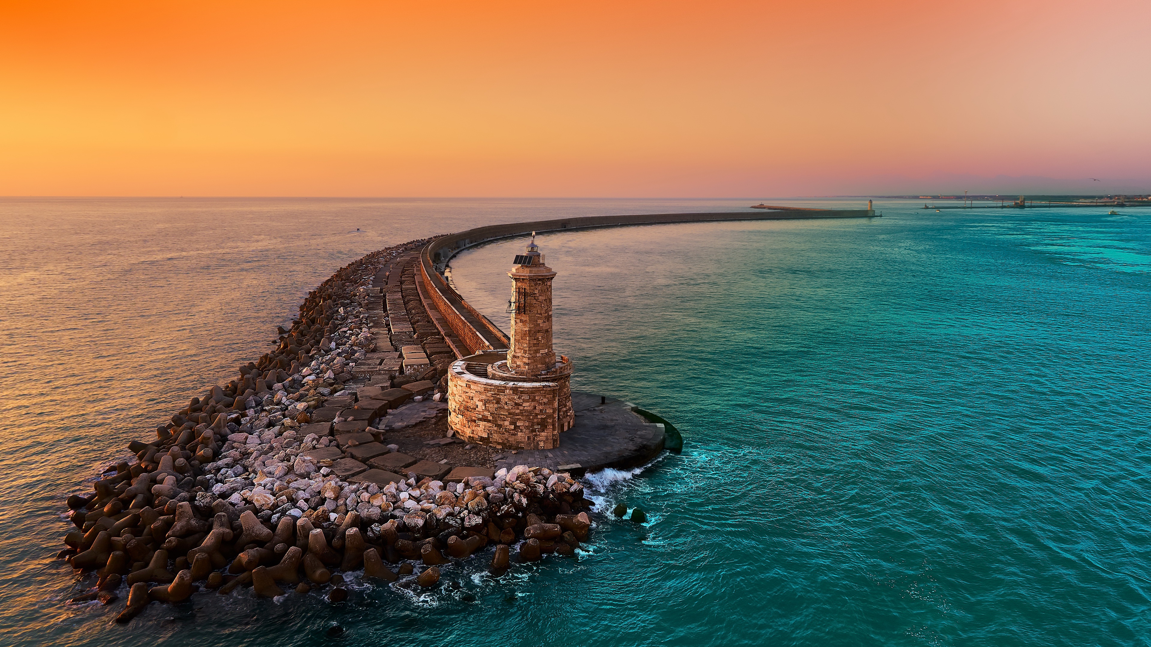 Description: A lighthouse on a rock outcropping in the ocean at sunset or dawn with a red sky.