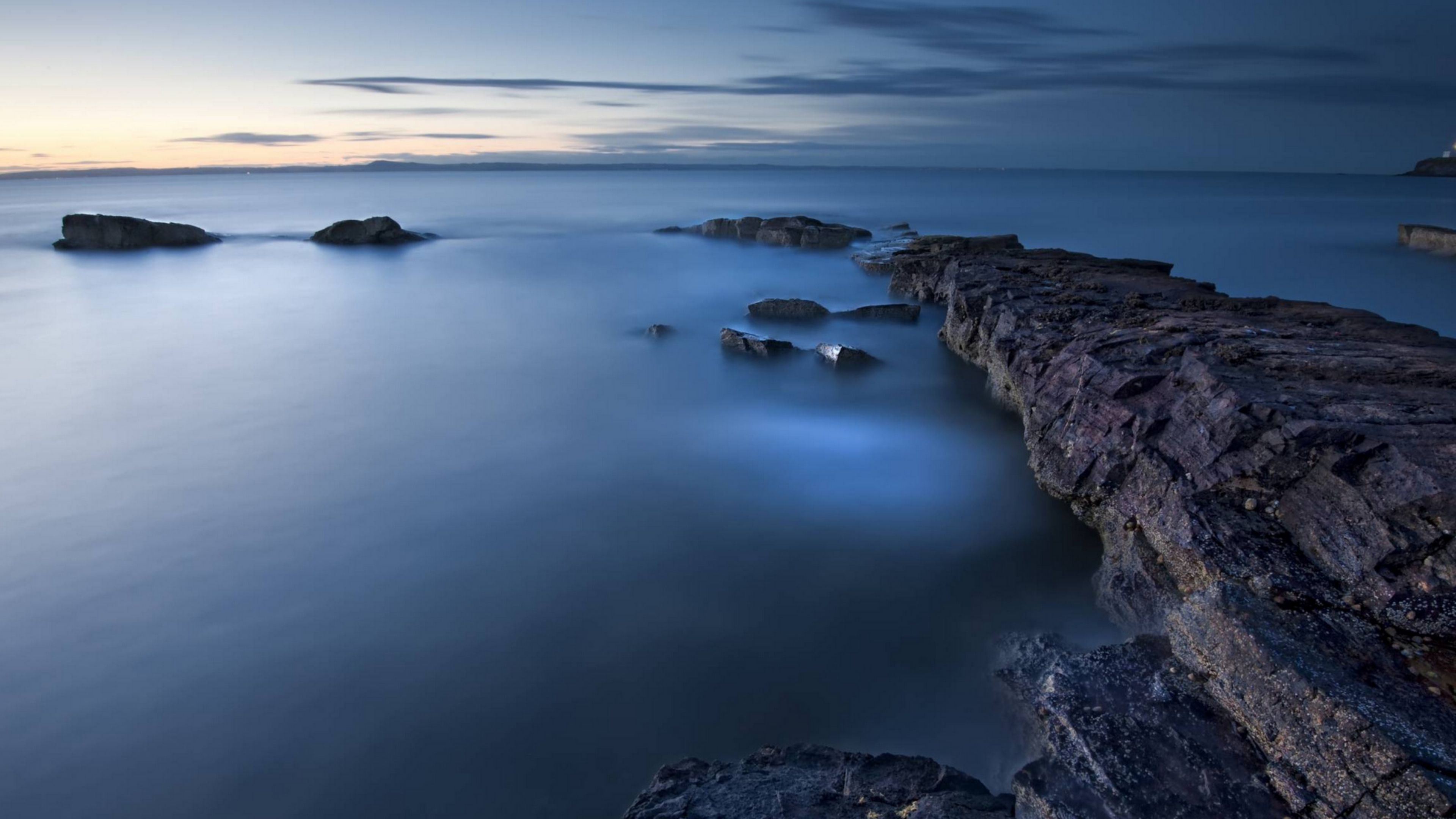 Description: A long exposure of a body of water with rocks in the foreground and a lighthouse in the distance.