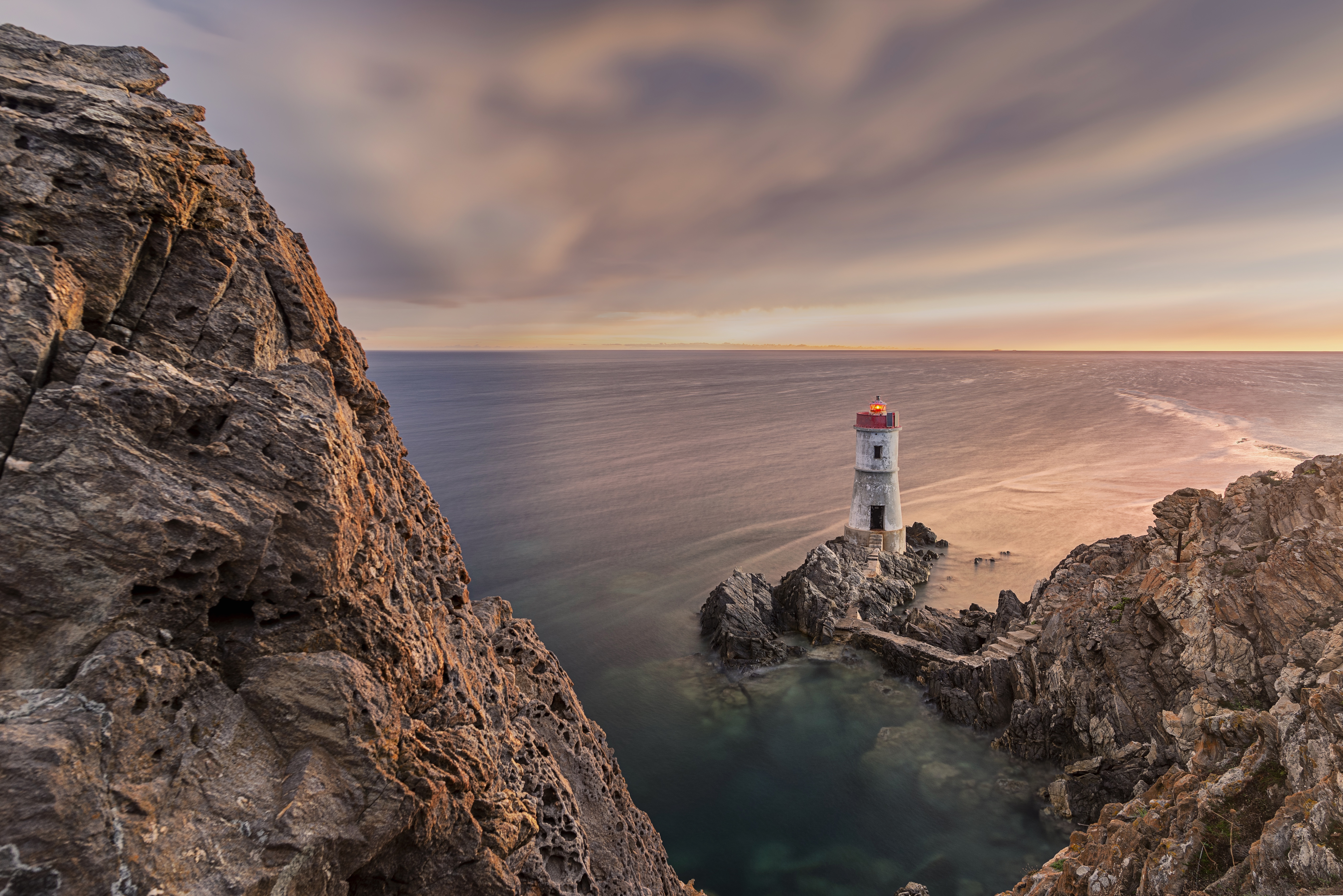 Description: A lighthouse on a rocky cliff overlooking the ocean at sunset or dawn with a cloudy sky above it and a boat in the water.