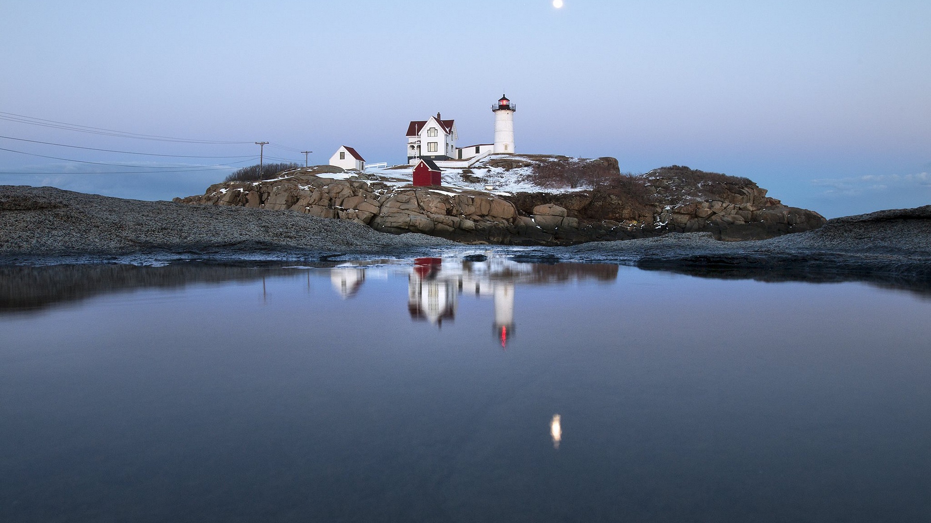 Description: A lighthouse on a rocky island with a body of water in front of it and a moon in the sky.