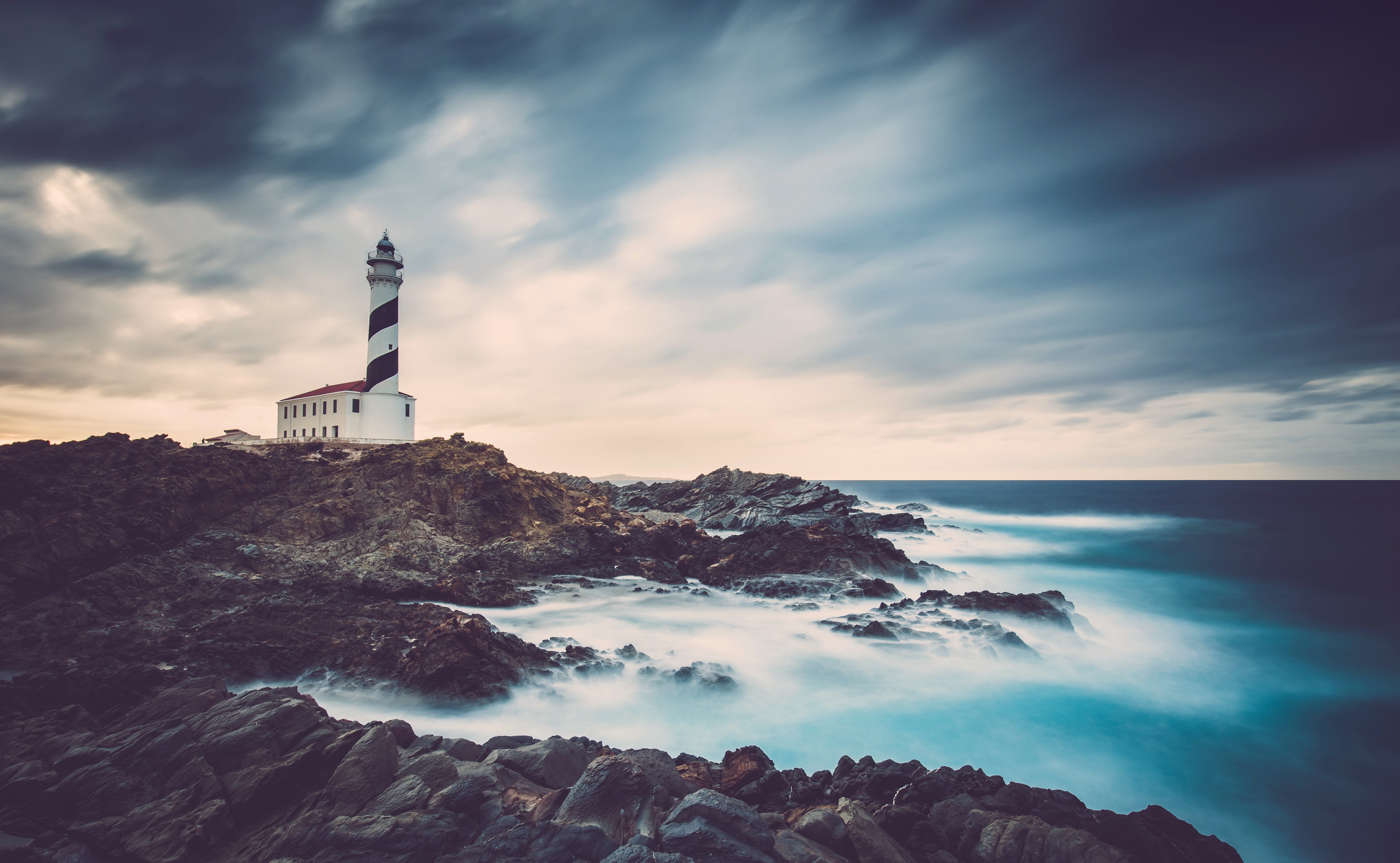 Description: A lighthouse on a rocky shore with a body of water in the foreground and a cloudy sky above.