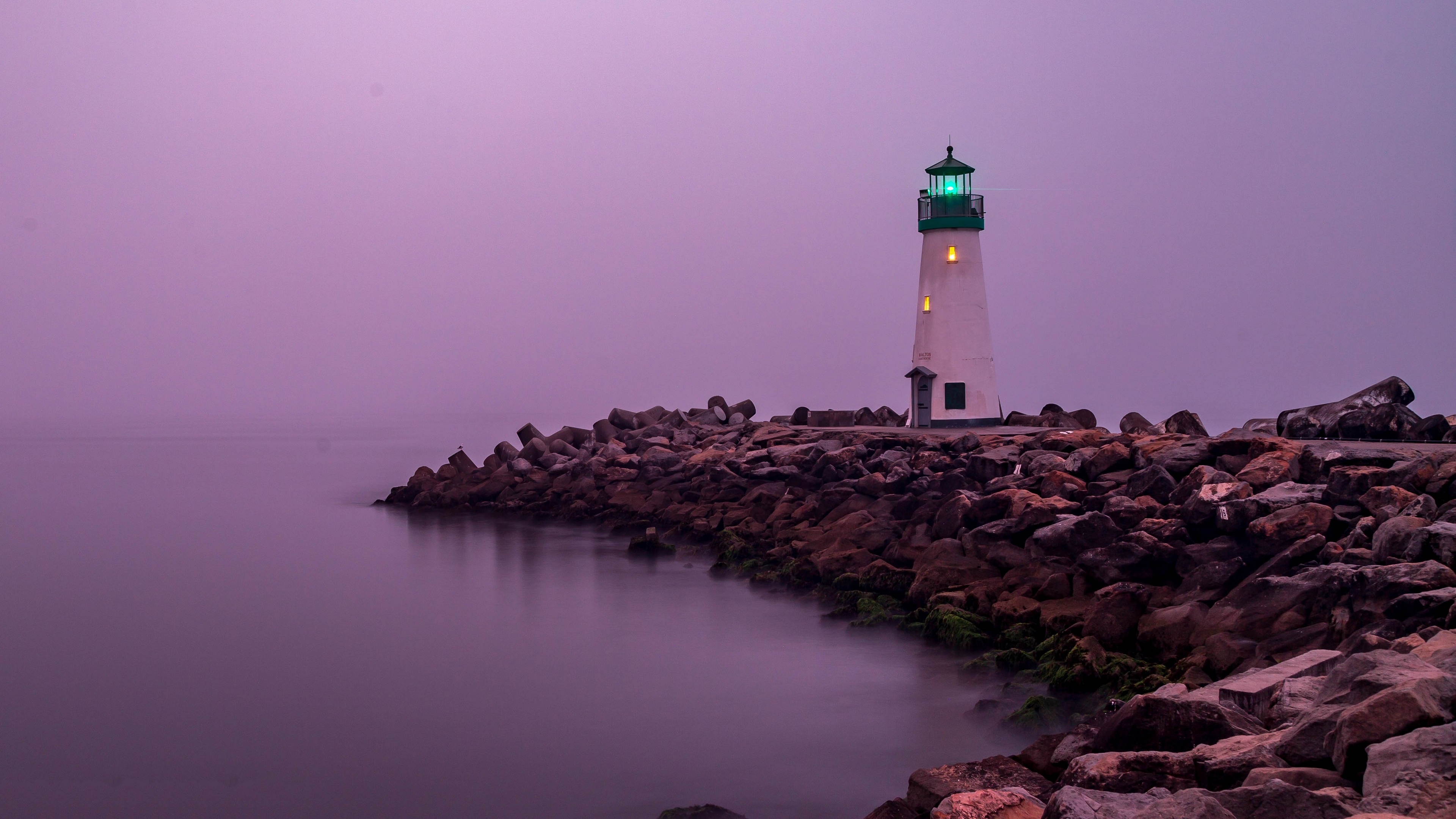 Description: A lighthouse on a rocky shore with a green light on it's top and a body of water below.