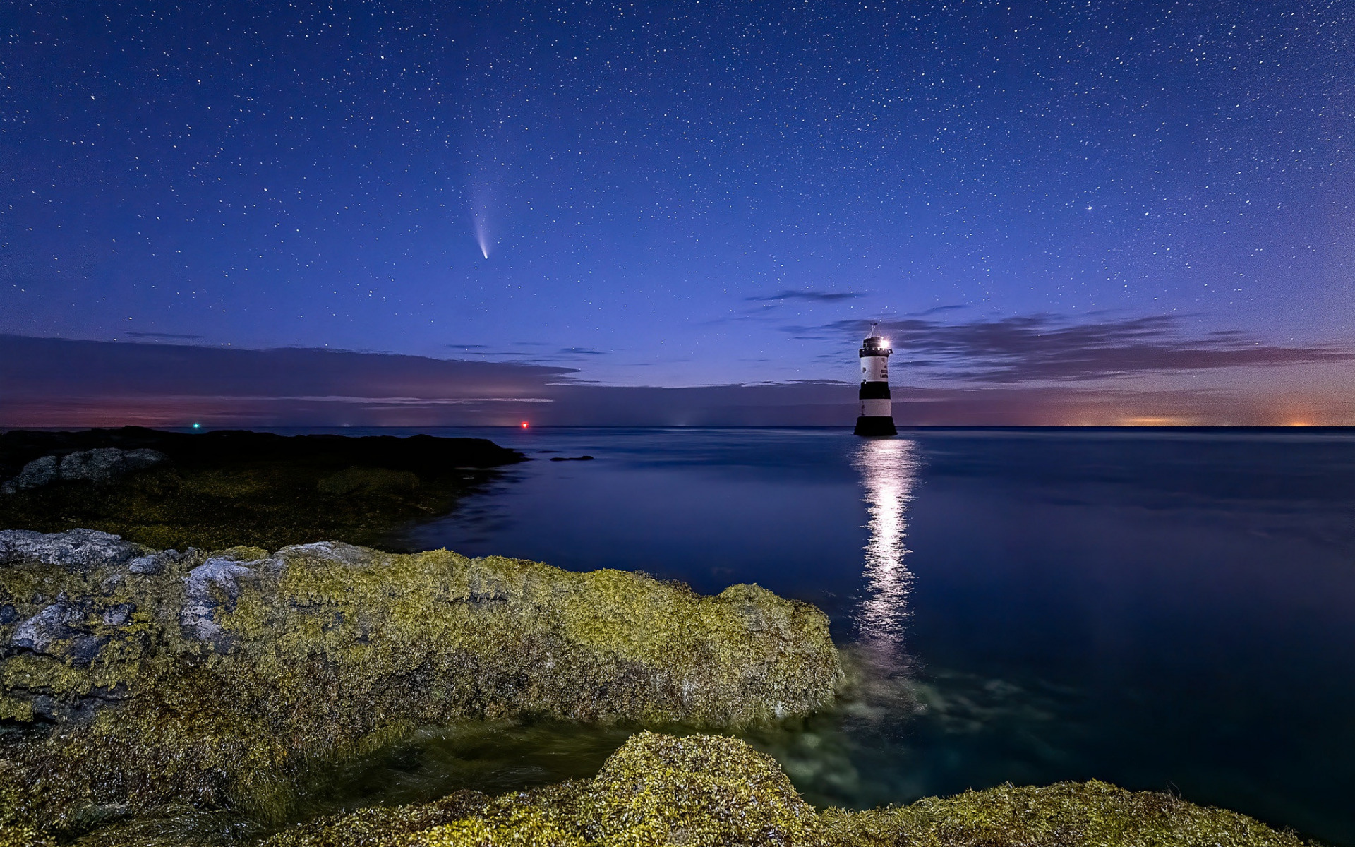 Description: A lighthouse on a rocky shore at night with a bright light in the sky above it and a body of water below.