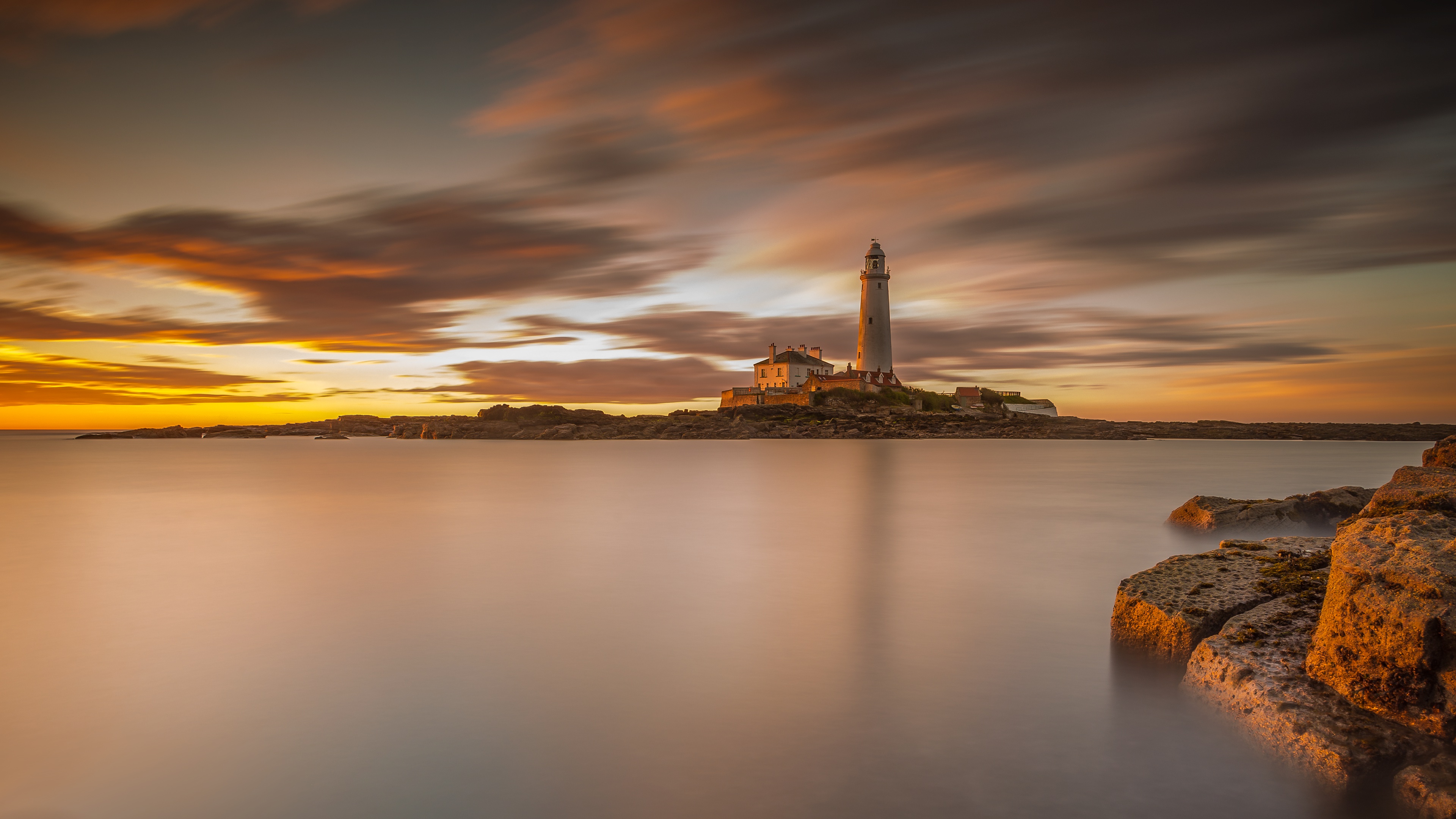 Description: A lighthouse on a rocky shore with a sunset in the background and clouds in the sky above it.
