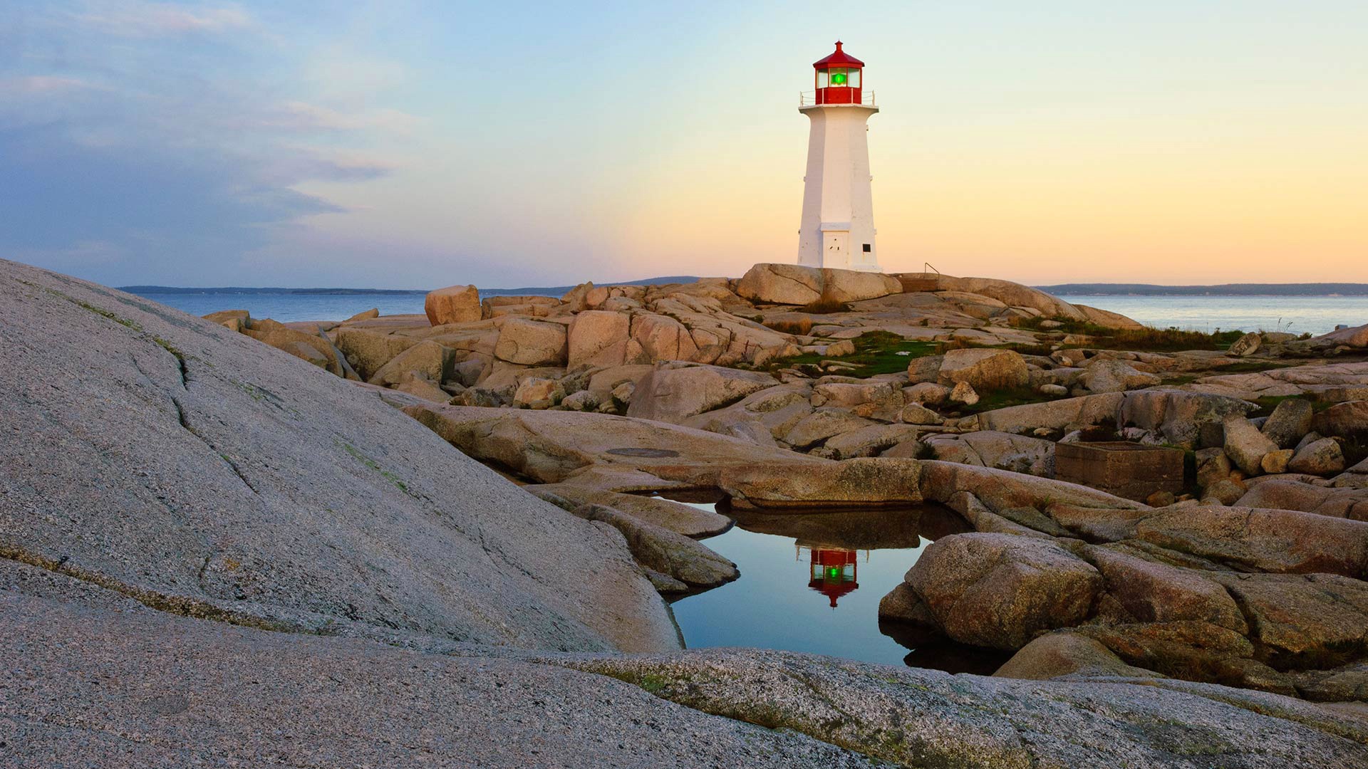 Description: A lighthouse on a rocky shore with a body of water in the foreground and a sunset in the background.