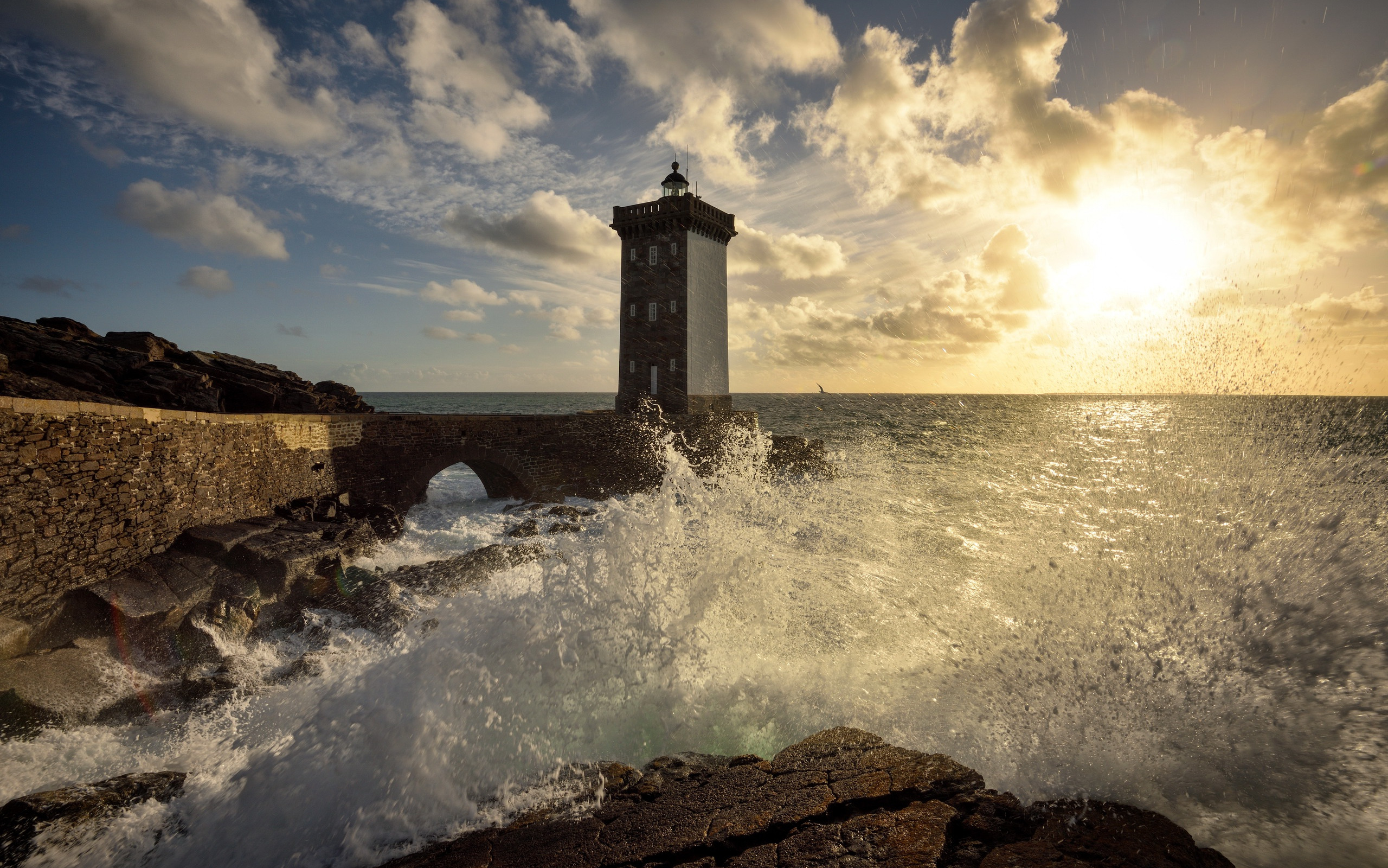 Description: A lighthouse on a rocky shore with a wave crashing against it and the sun shining through the clouds above.