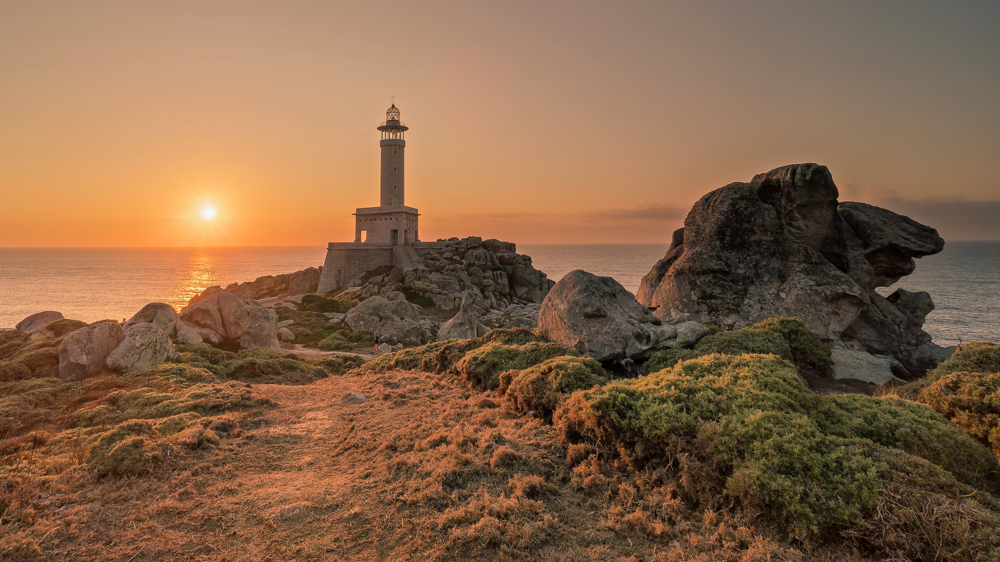 Description: A lighthouse on a rocky cliff with the sun setting in the background and the ocean in the foreground.