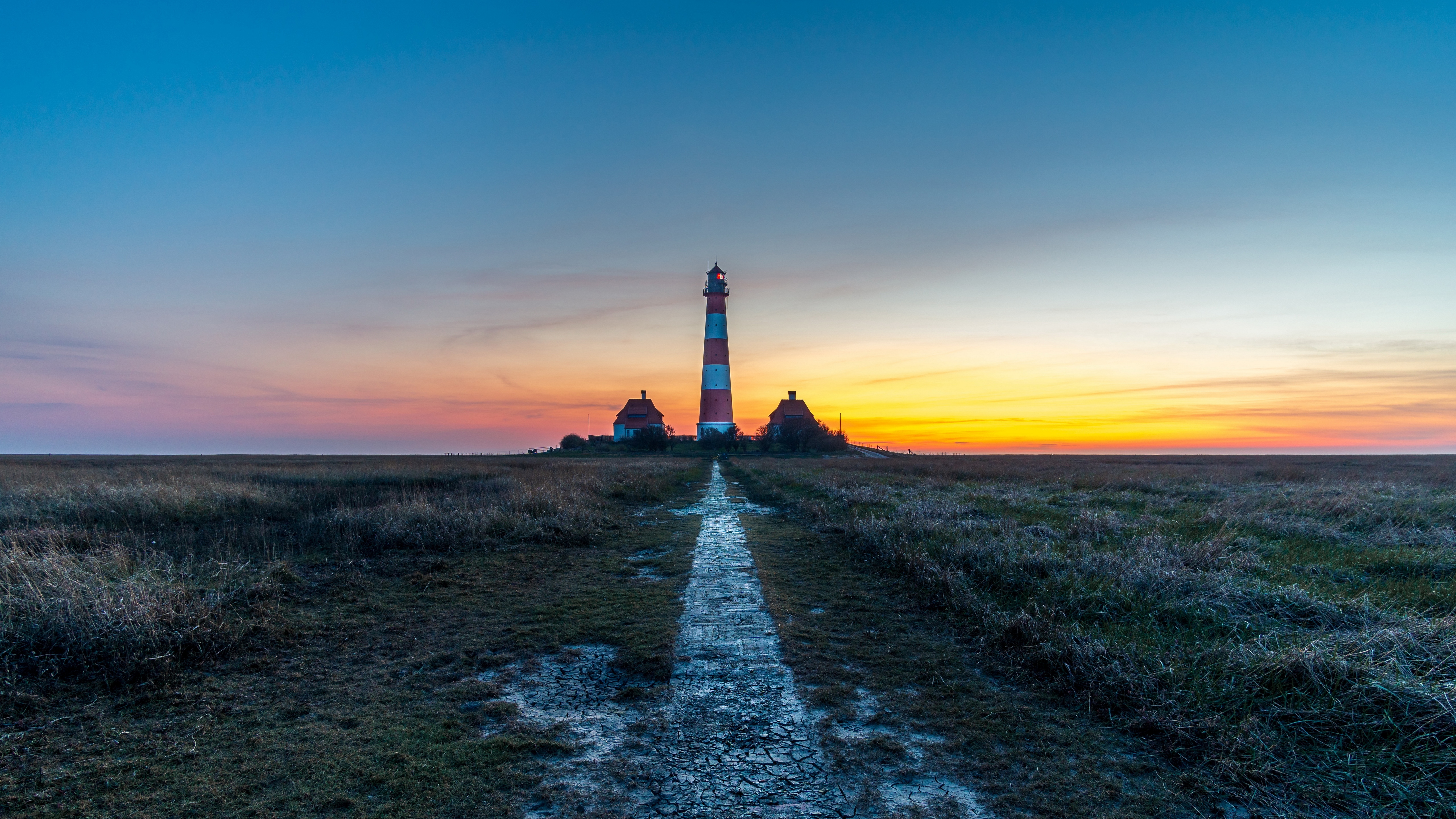 Description: A lighthouse on a grassy field at sunset with a path leading to it and a path leading to it.