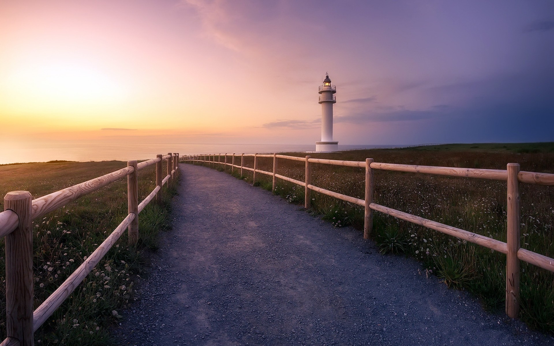 Description: A path leading to a lighthouse on a hill at sunset with a fence in the foreground and a body of water in the background.