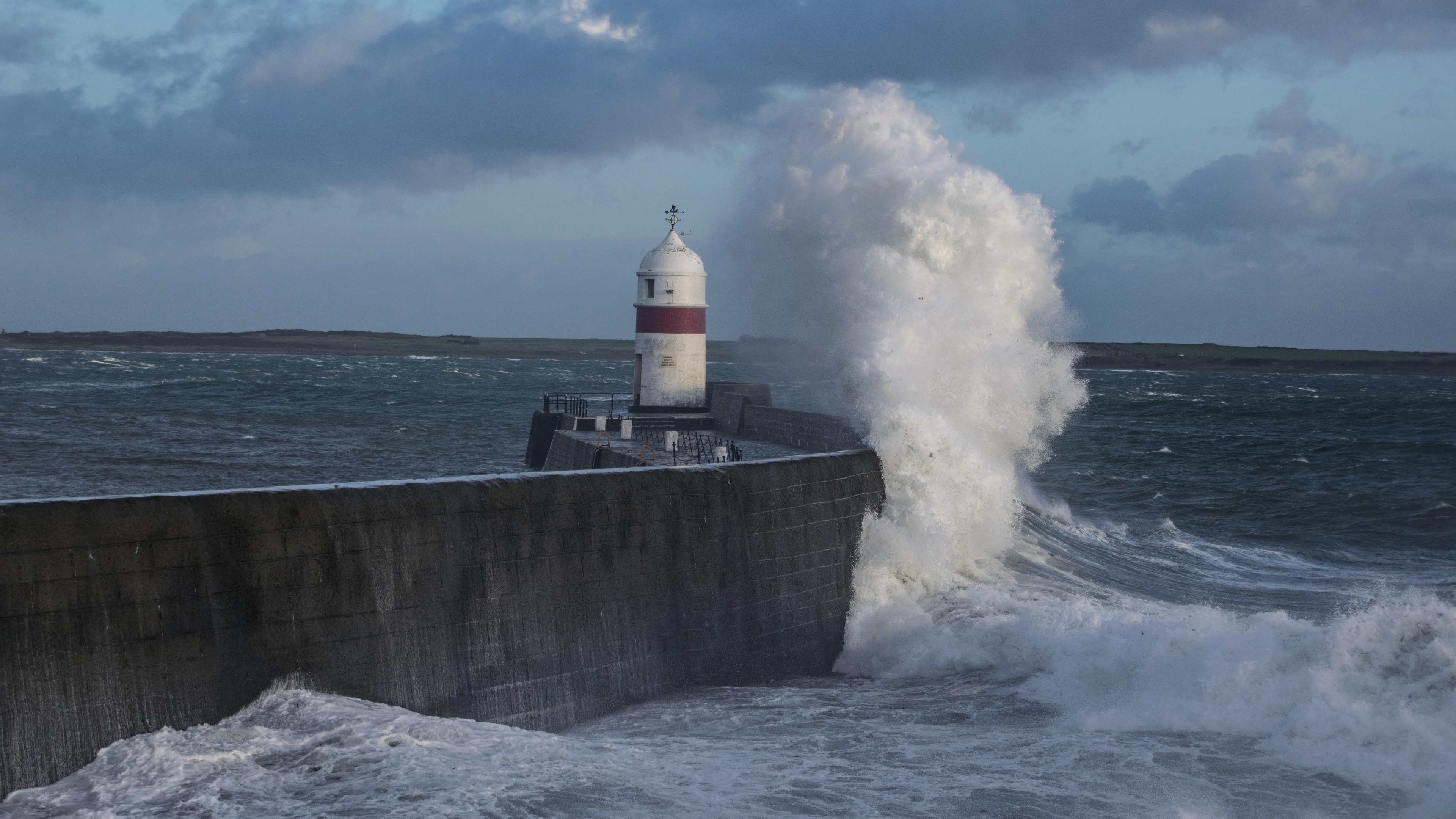 Description: A lighthouse is surrounded by a large wave in the ocean near a concrete wall and a concrete wall with a lighthouse on it.