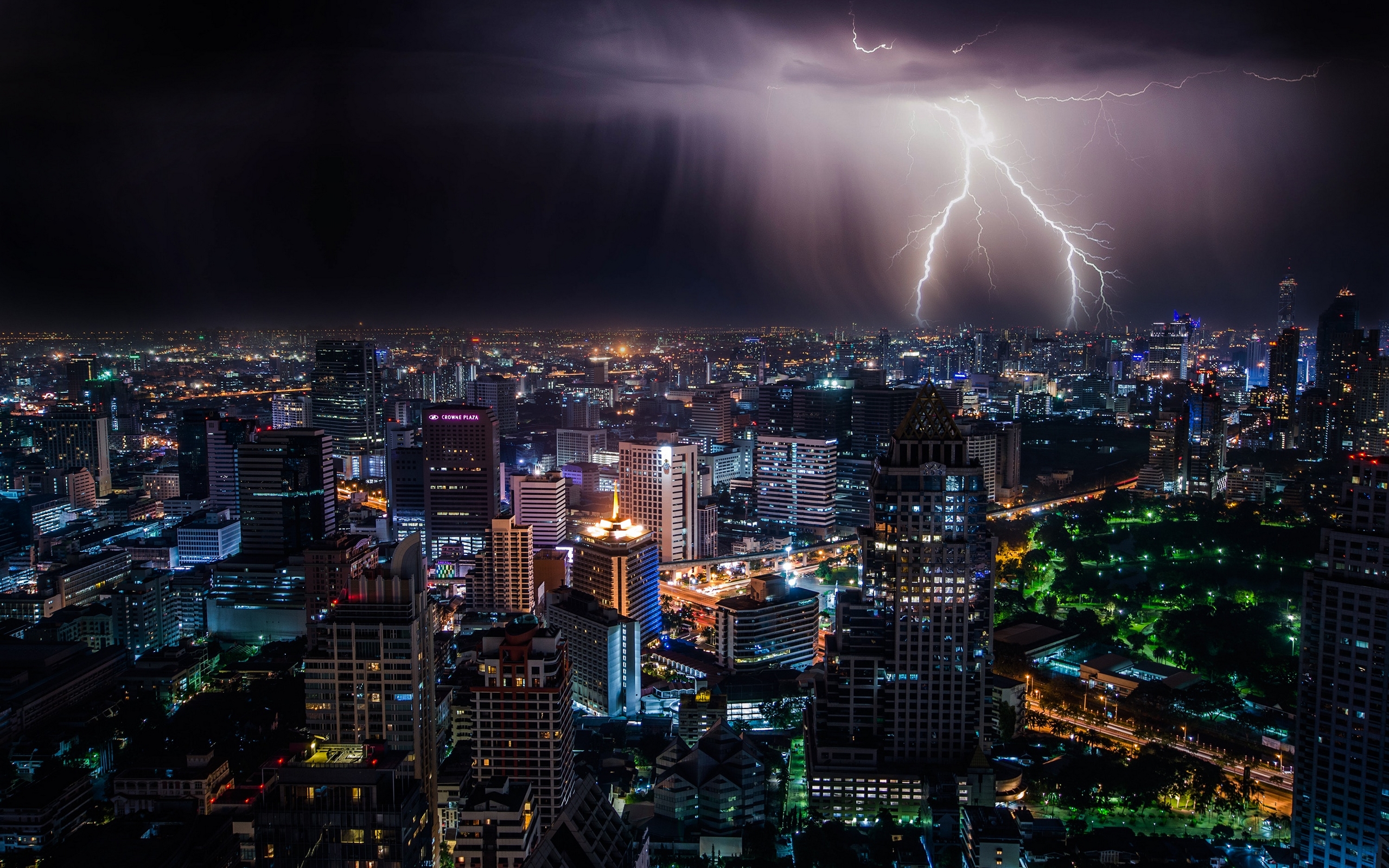 Description: A lightning bolt strikes over a city at night time with a lot of lights in the sky and buildings lit up.
