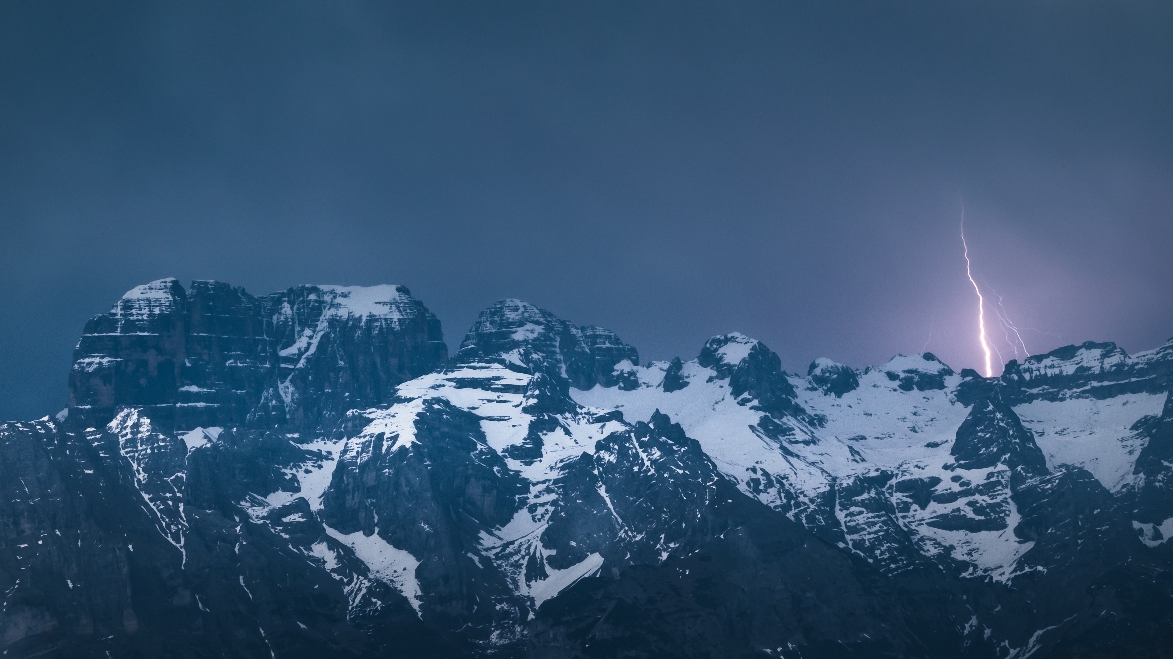 Description: A lightning bolt is seen over a mountain range in the distance.