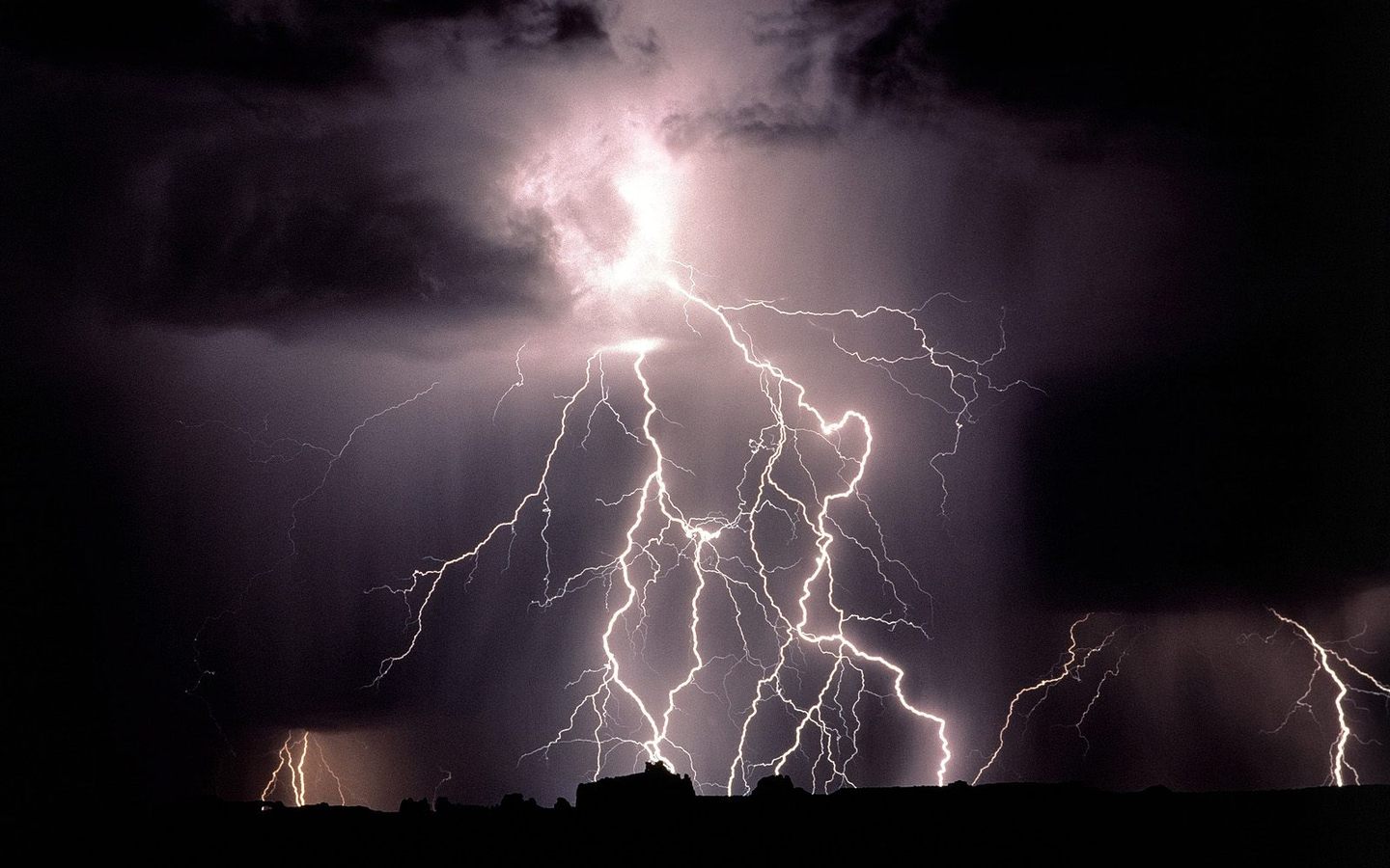 Description: A lightning storm is seen over a mountain range in the night sky with a black background and a silhouette of a person.