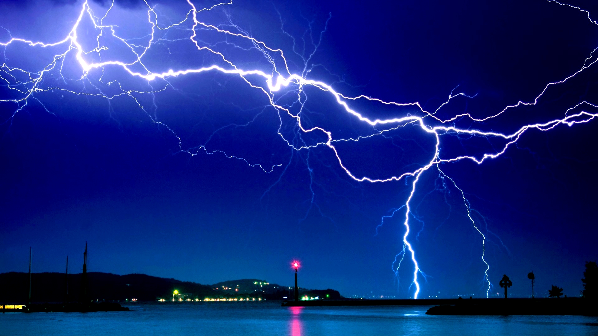 Description: A lightning storm is seen over a body of water at night with a red light in the distance and a blue sky.