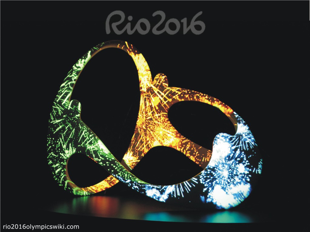 Description: A couple of lights that are on a table with a name on it and fireworks in the background of the picture.