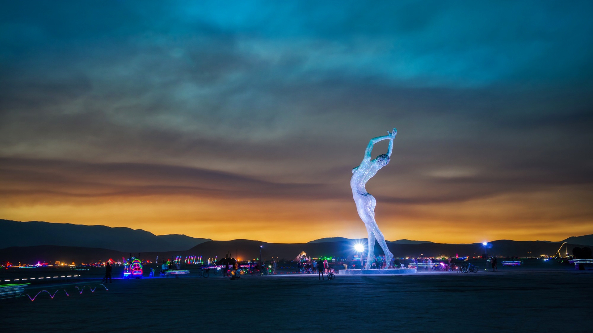 Description: A statue of a woman is in the middle of a field at night with a sky background and a colorful sky.