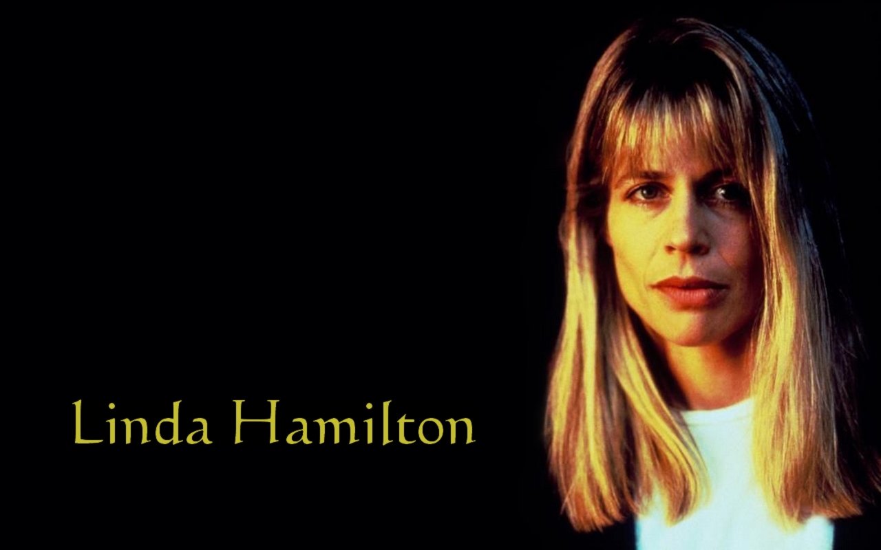 Description: A woman with long blonde hair and a white shirt is looking at the camera with a black background and a yellow text that reads linda hamilton.