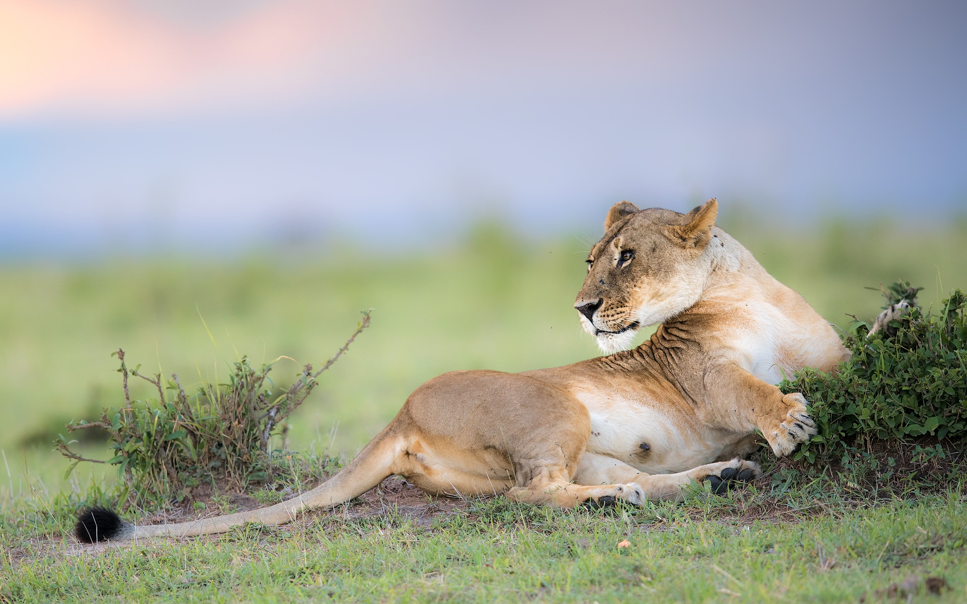 Description: A lion laying down in the grass with its head on a bush and looking at the camera with a blurry background.