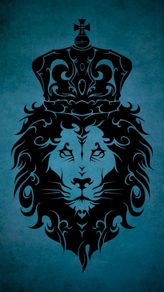 Description: A lion with a crown on its head is shown in black and blue colors on a blue background with a black and white pattern.