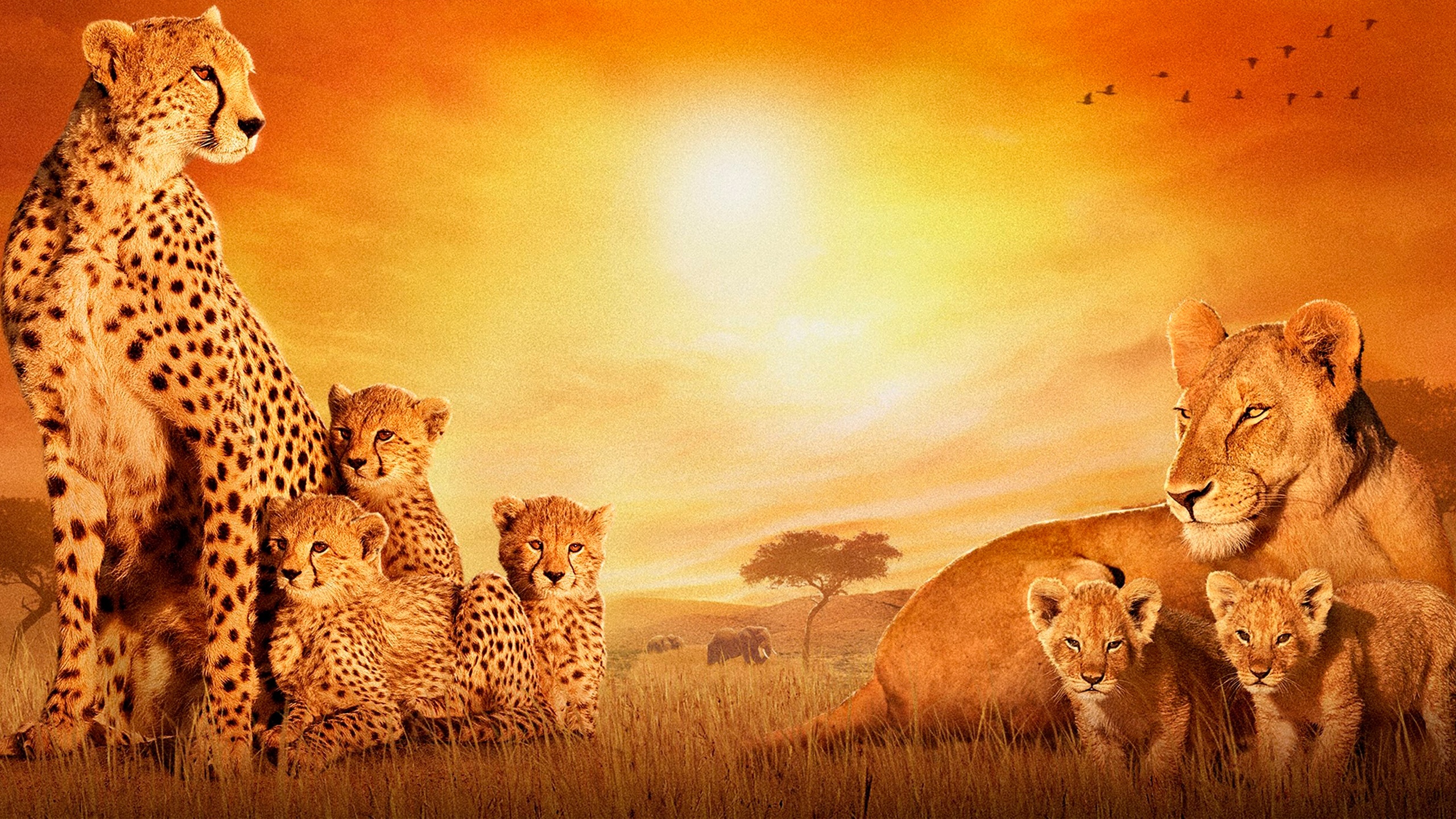 Description: A family of lions and lions in a field with a sunset in the background and a painting of a lion family.