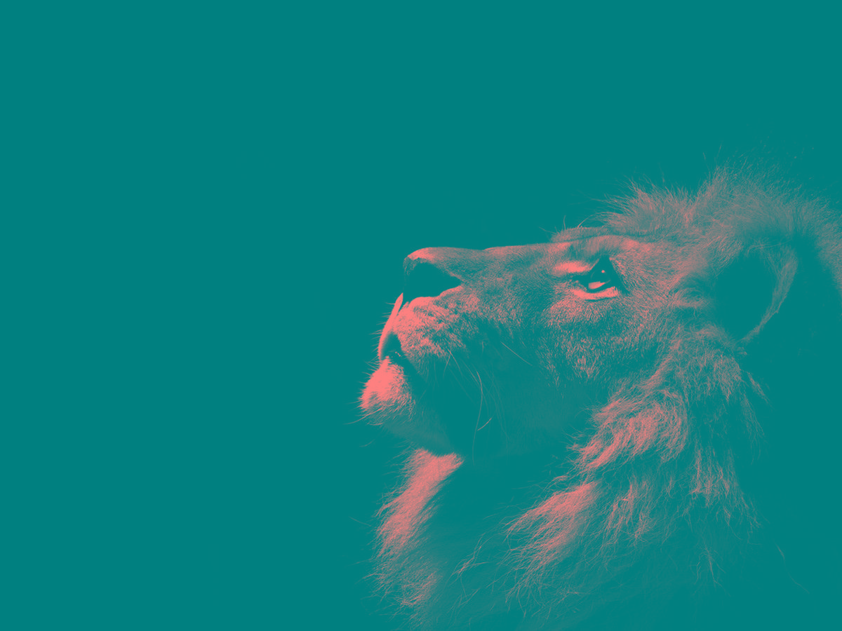 Description: A lion looking up into the sky with its head turned to the right and eyes open.
