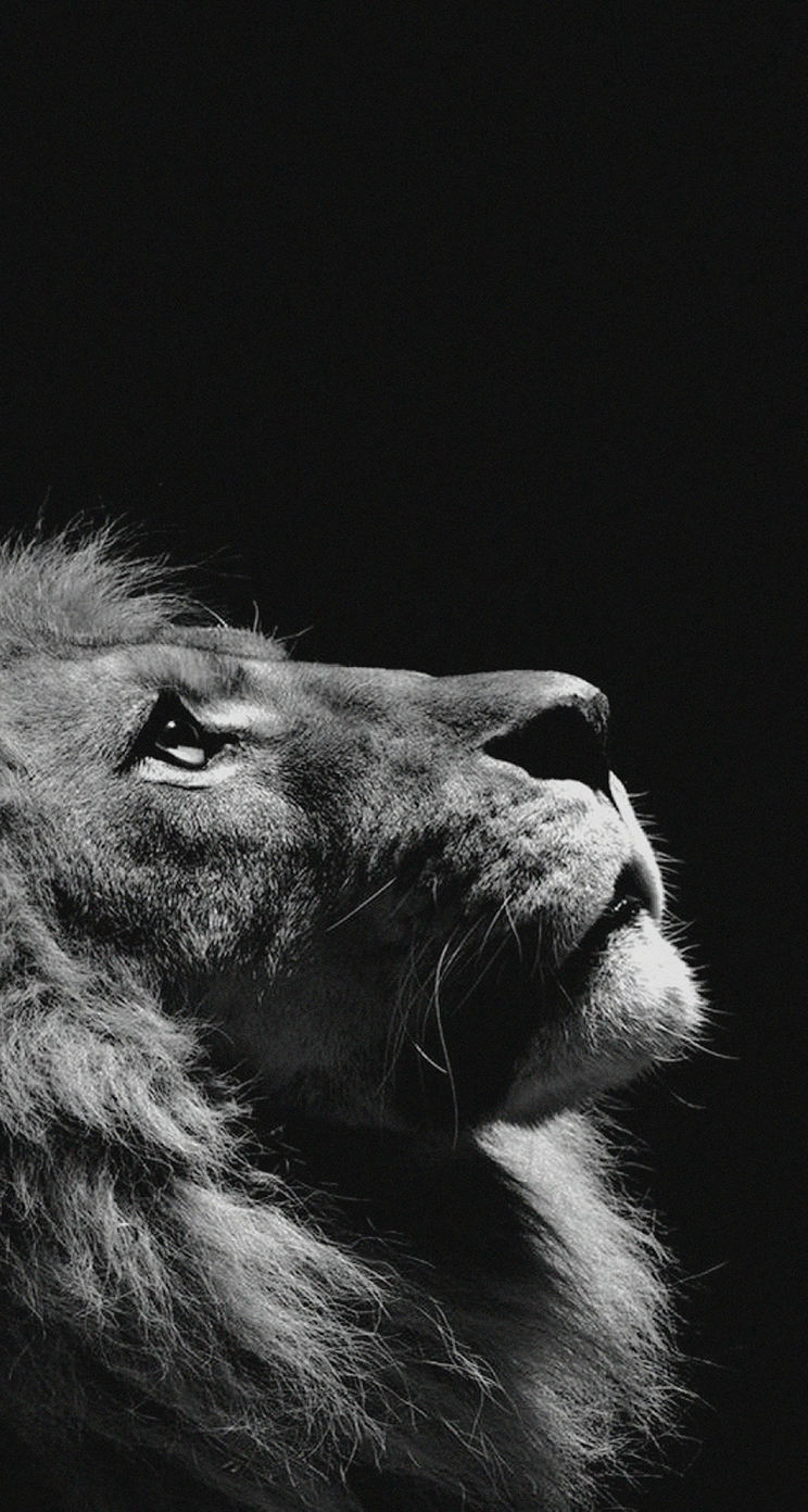 Description: A lion is looking up at something in the dark sky with its eyes open and a black background is also visible.