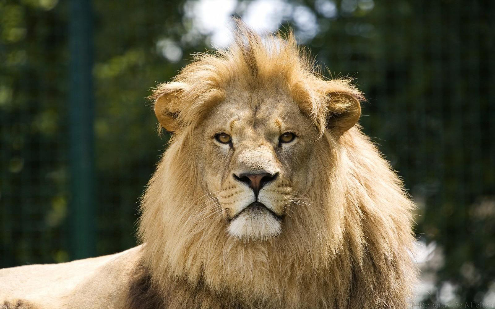 Description: A lion with a long mane standing in front of a fenced area with trees in the background and a green fence.
