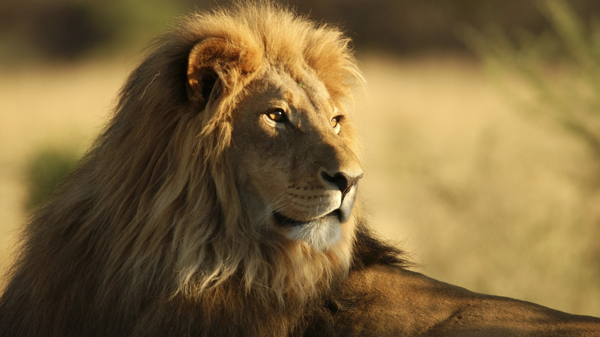 Description: A lion with a long mane standing in a field of grass and bushes in the background.
