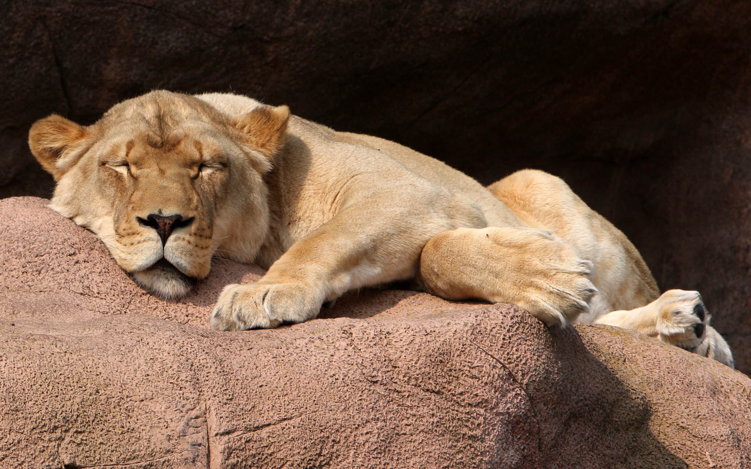 Description: A lion laying on a rock in a zoo enclosure with its eyes closed and his head resting on the rock.