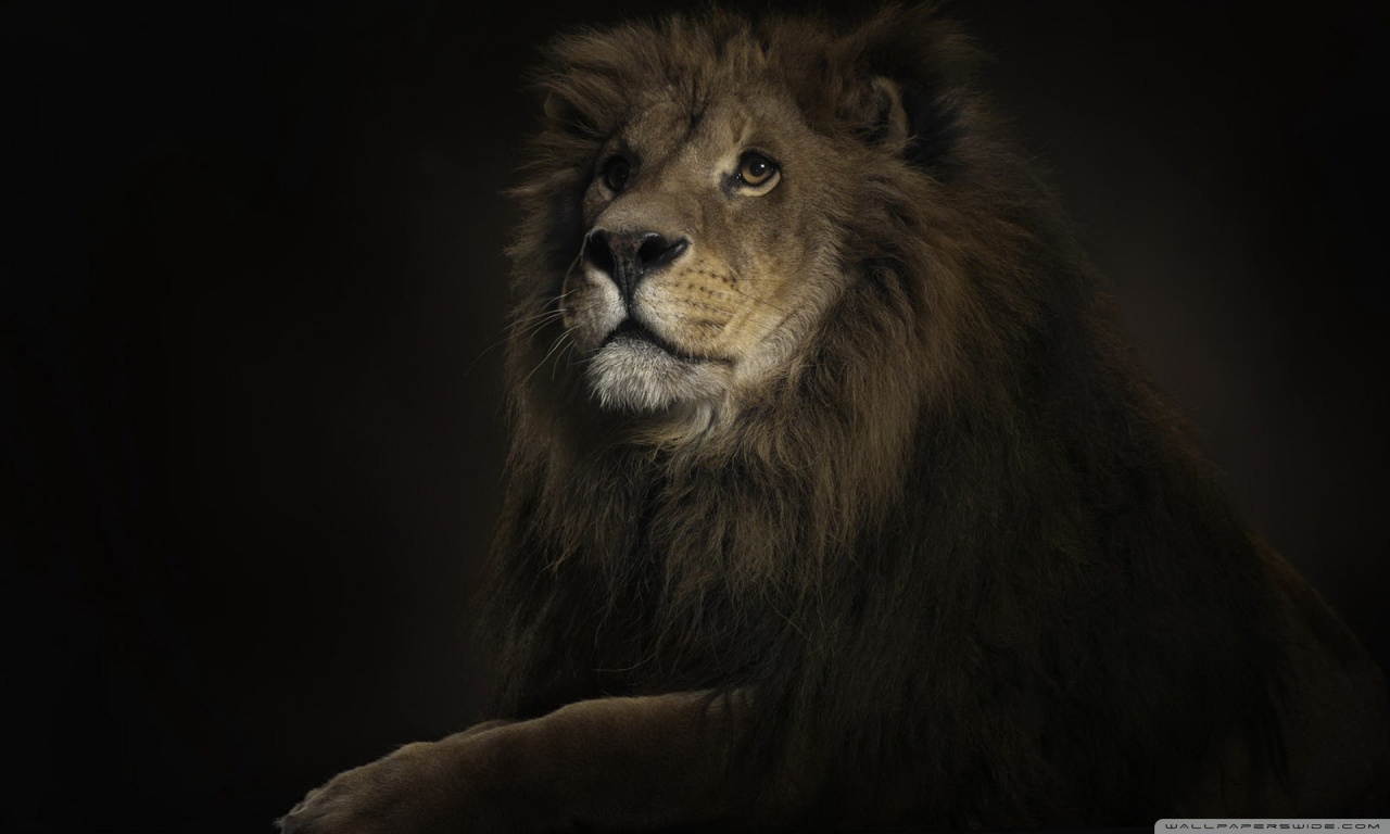 Description: A lion is sitting down in the dark with its eyes open and a black background is behind it and a black background is behind it.