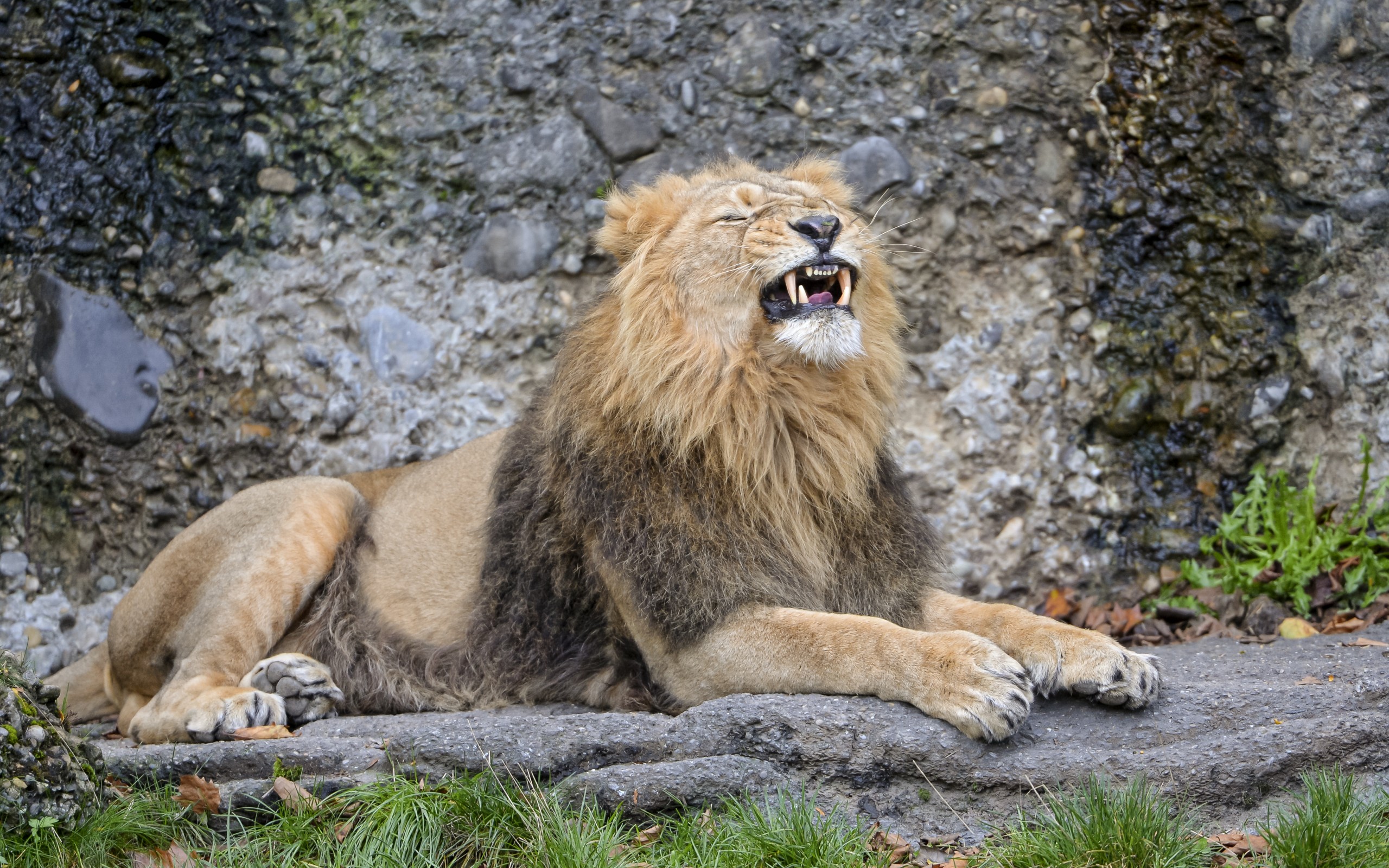 Description: A lion yawns while sitting on a rock in front of a rock wall and grass and rocks.