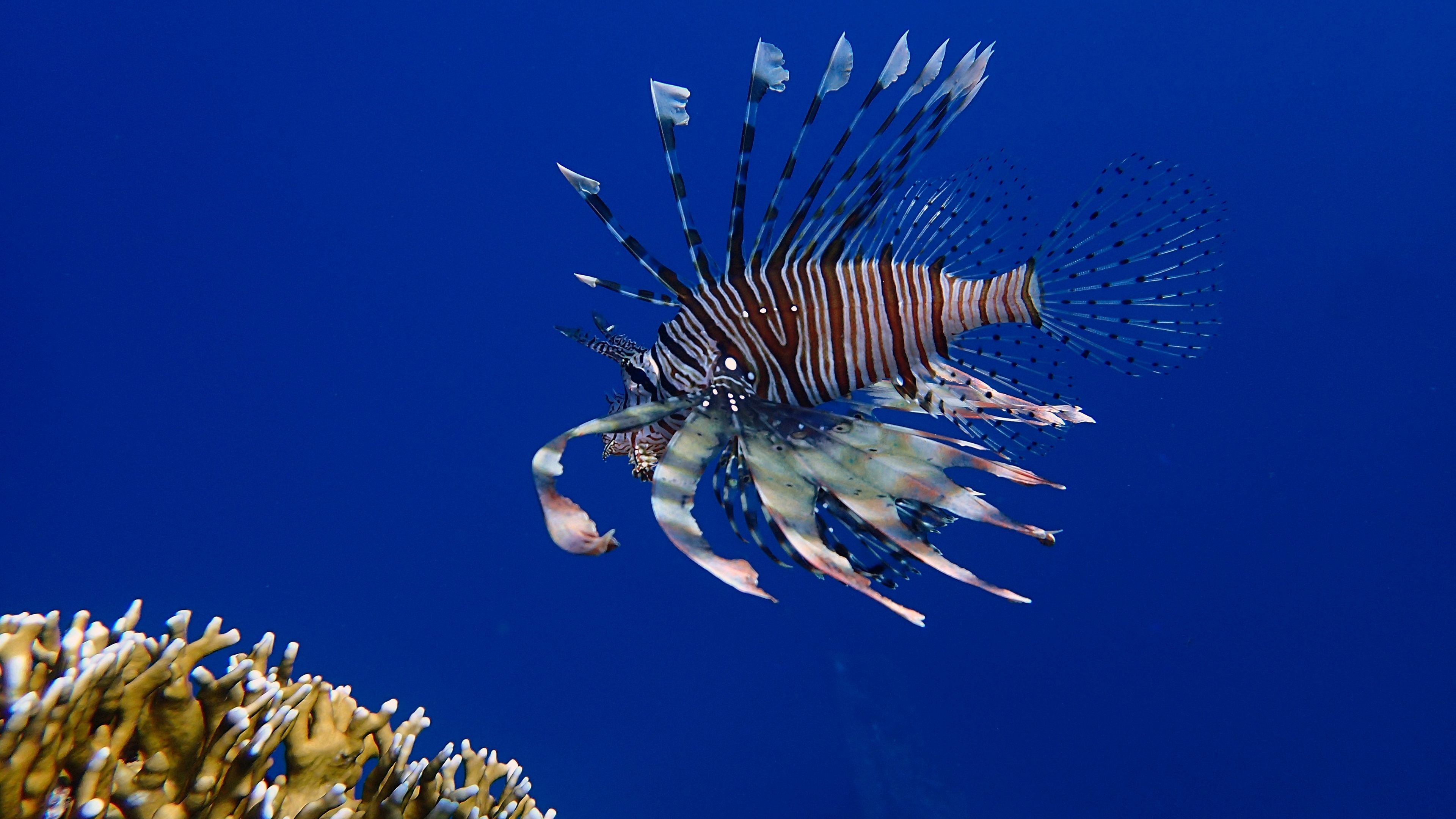 Description: A lionfish swims in the blue water near corals and sponges of corals in the ocean.