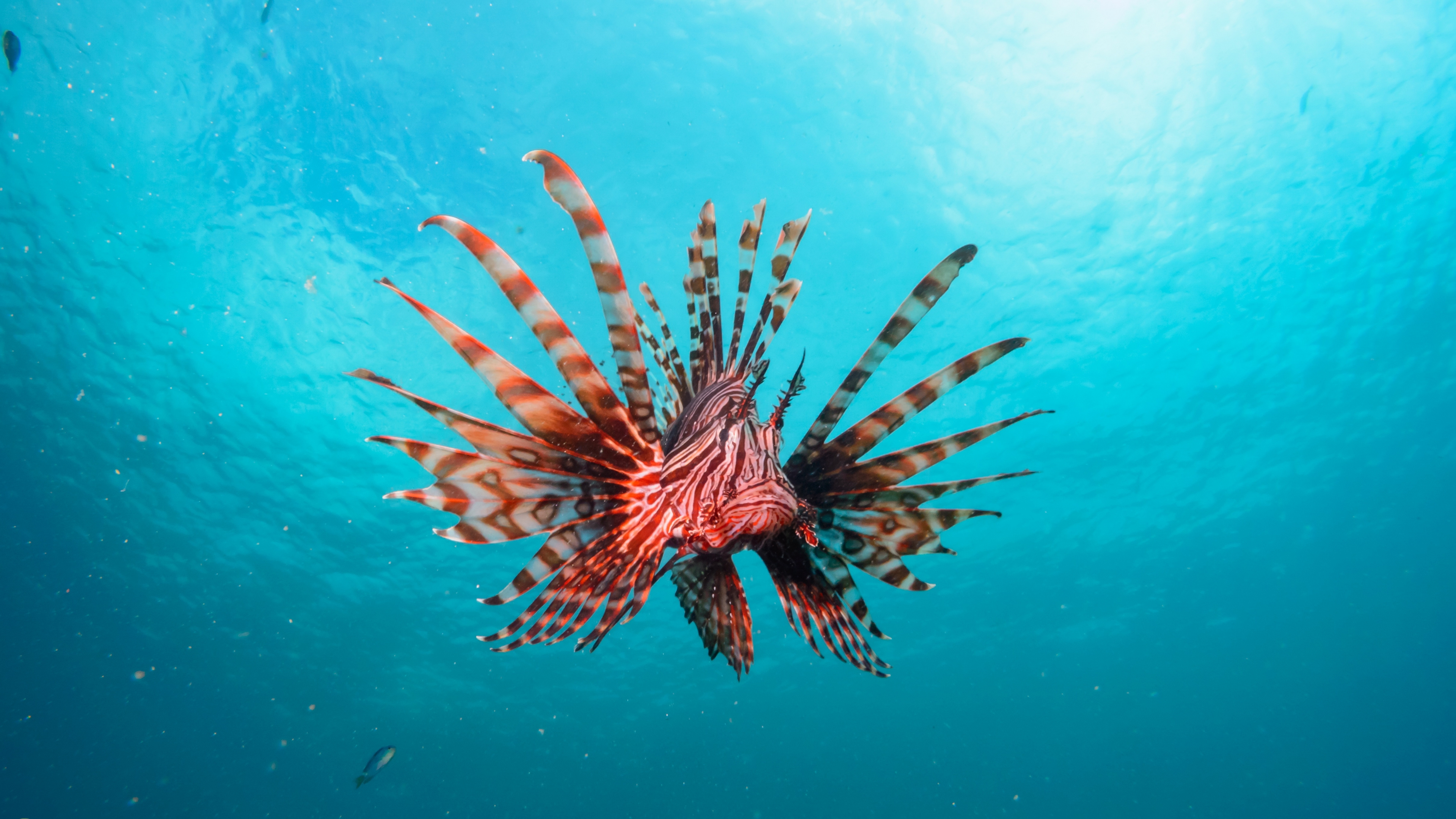 Description: A lionfish swims in the blue water near a coral reef in the ocean.