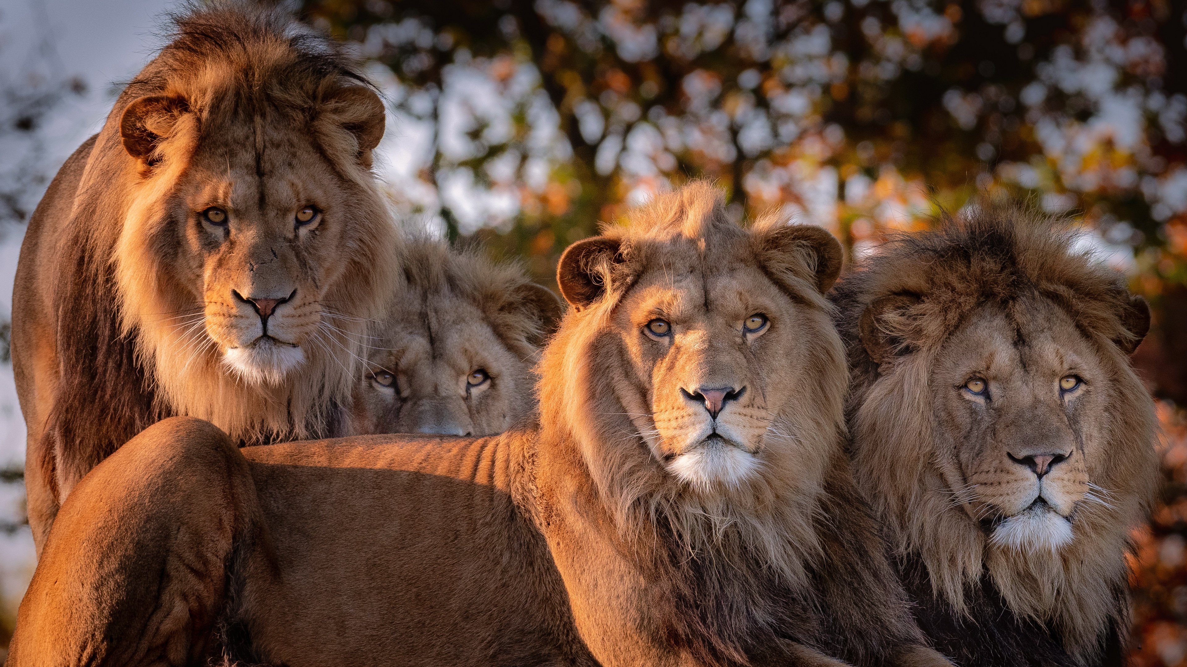 Description: A group of lions sitting on top of a rock together in a forest area with trees in the background.