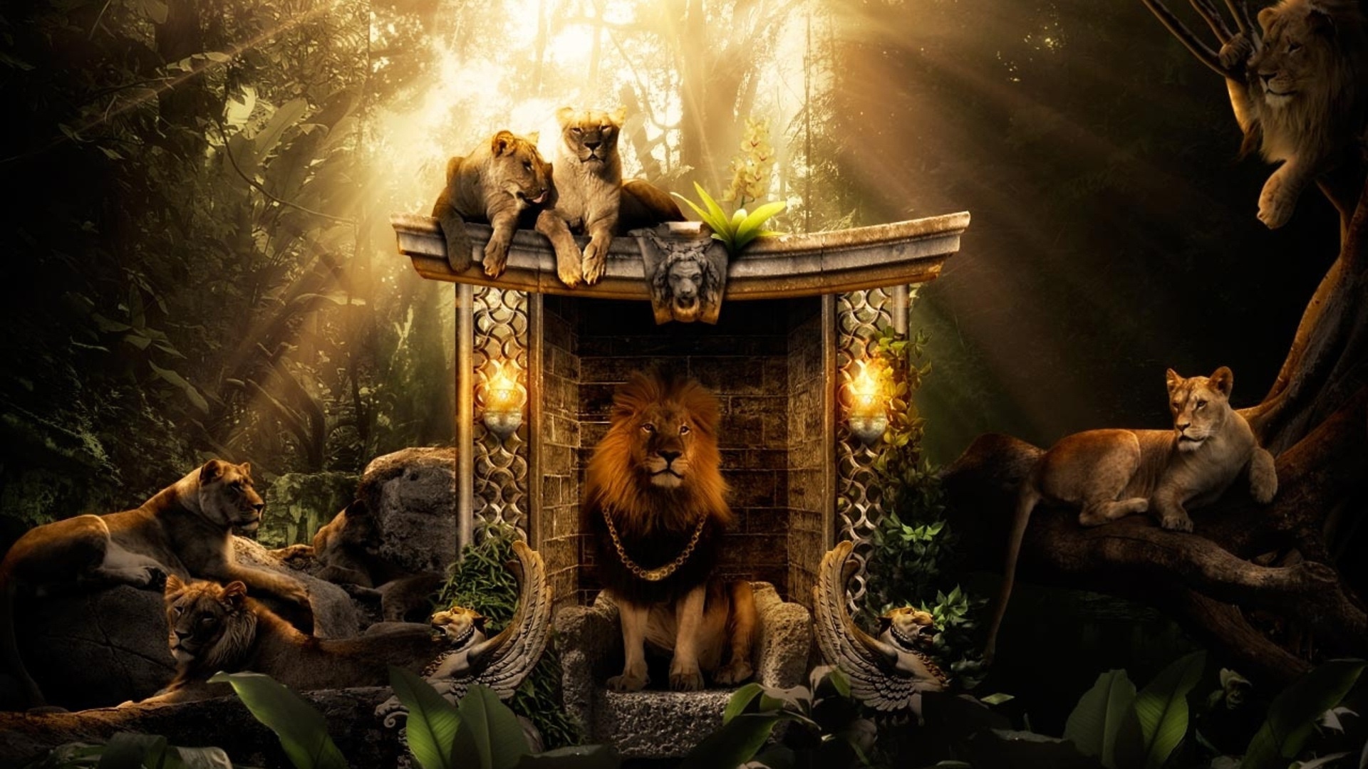 Description: A group of lions sitting on top of a wooden structure in the middle of a forest with a light shining through the trees.