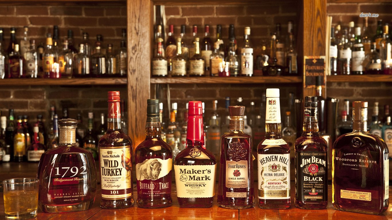 Description: A row of bottles of liquor sitting on a bar top next to a glass of wine and a bottle of liquor.