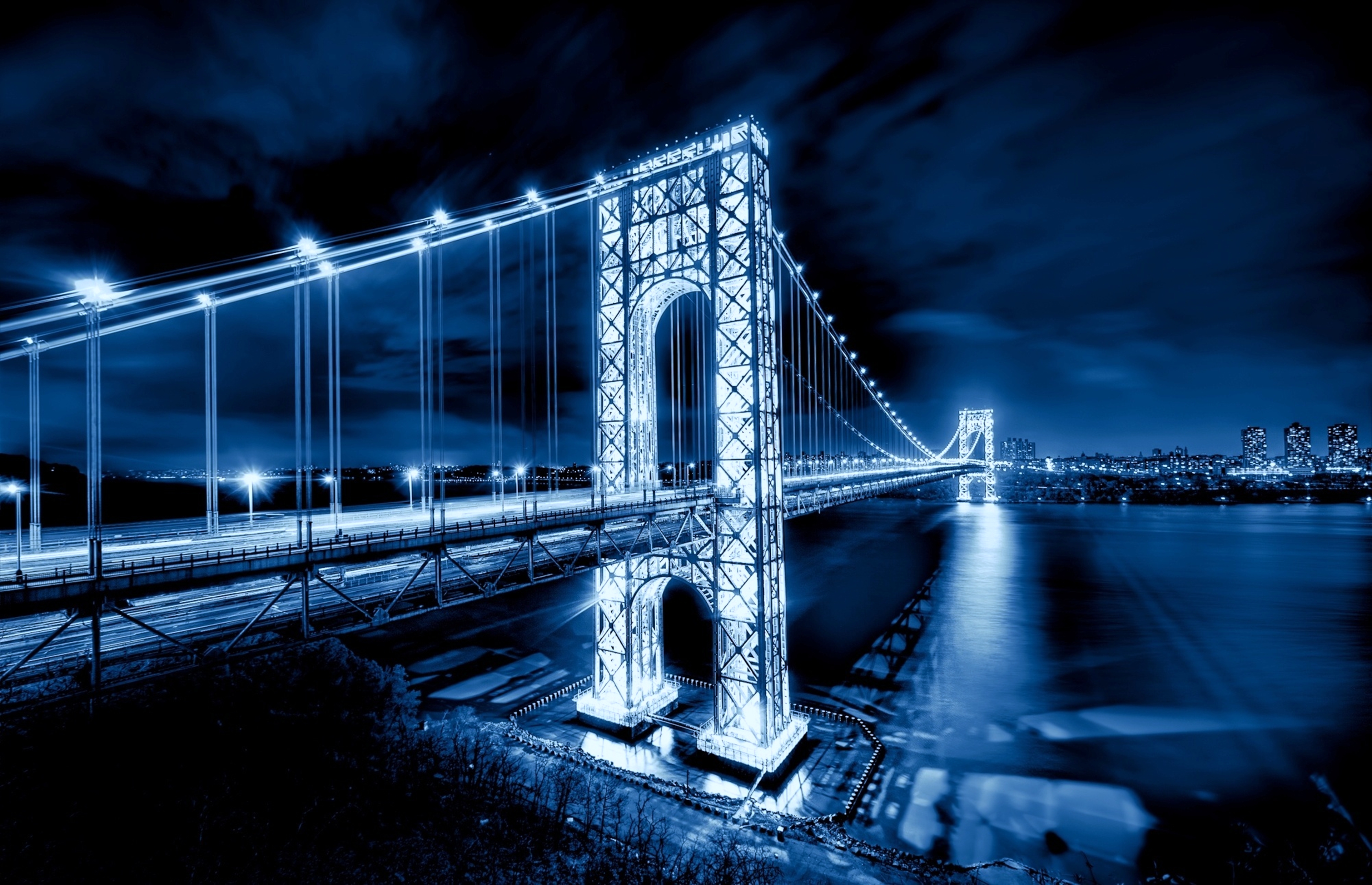 Description: A bridge that is lit up at night with lights on it and a city in the background at night.