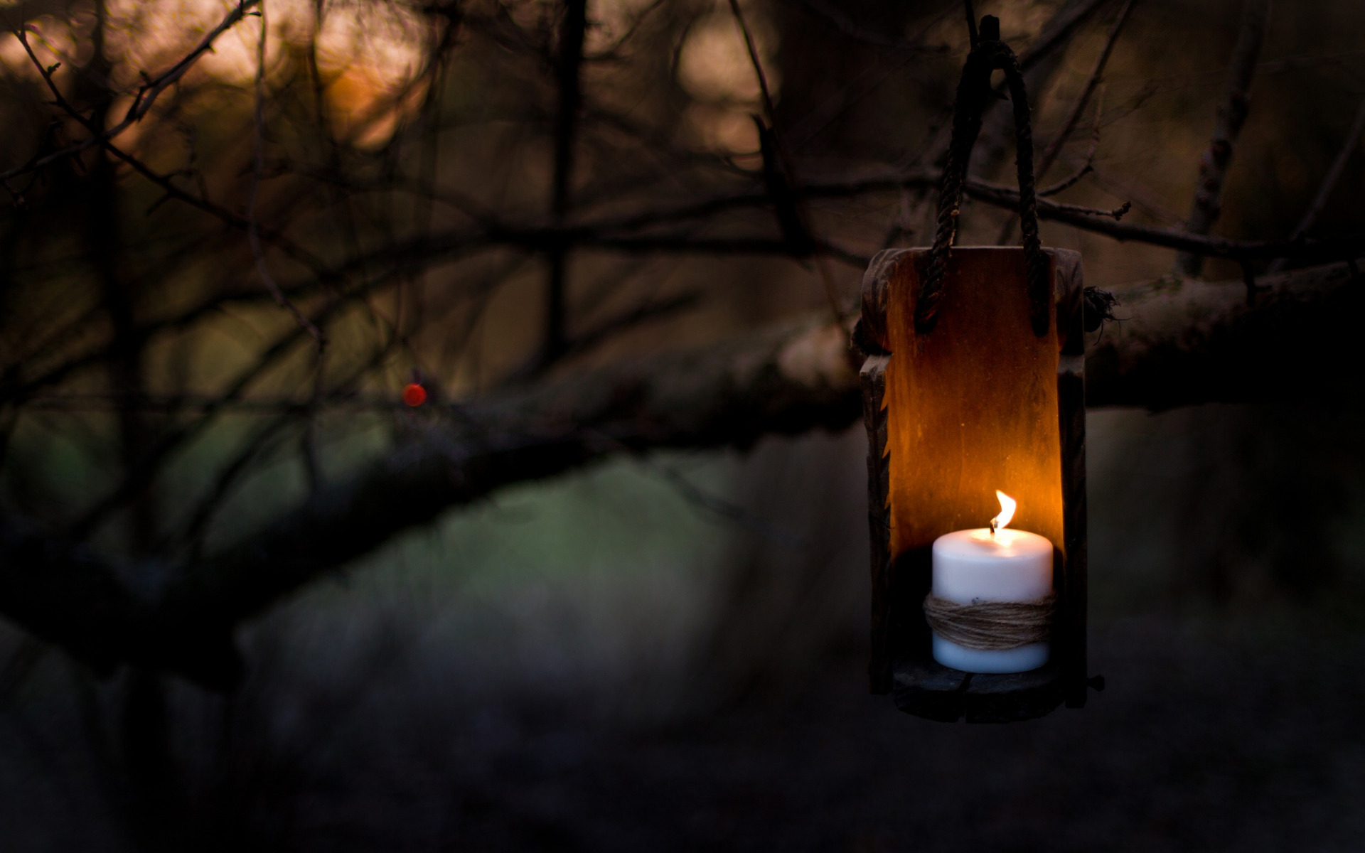 Description: A candle is lit in a hanging lantern in the dark forest at night time.