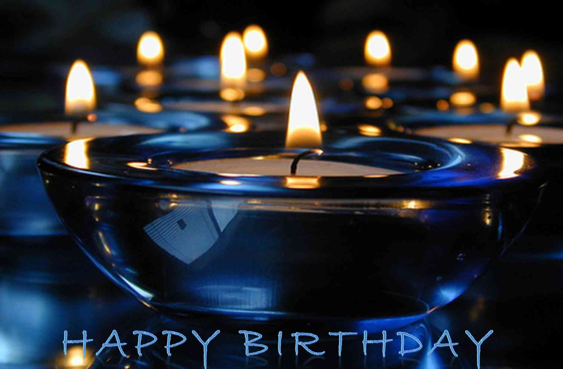 Description: A group of lit candles sitting in a bowl on a table with a happy birthday message on it's side.