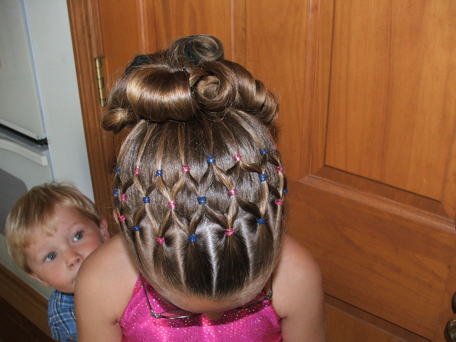 Description: A little girl with a messy bun with a pony tail braid and a little boy with a blue shirt.
