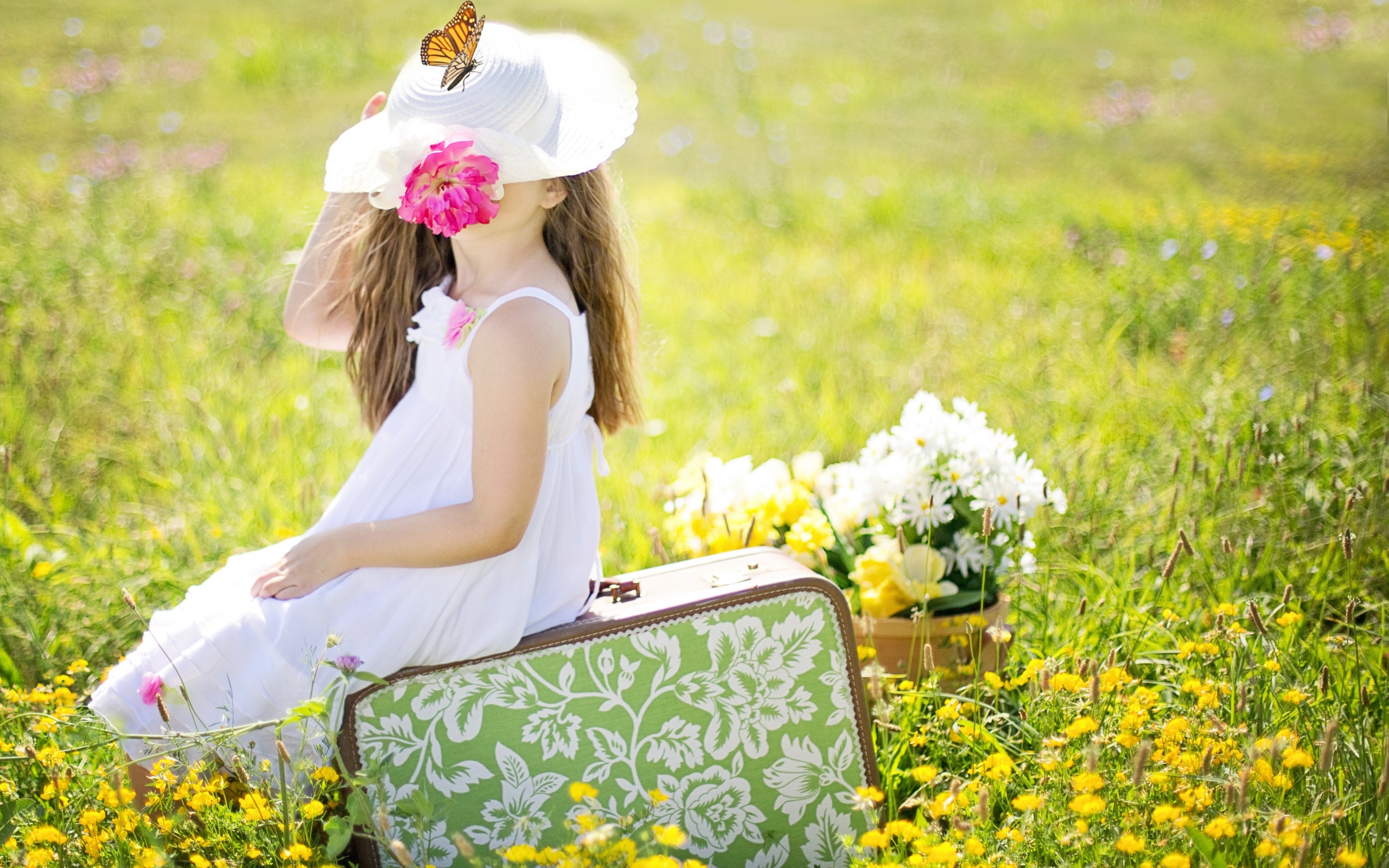 Description: A little girl sitting in a field with a suitcase and a butterfly on her head and a flower in her hair.