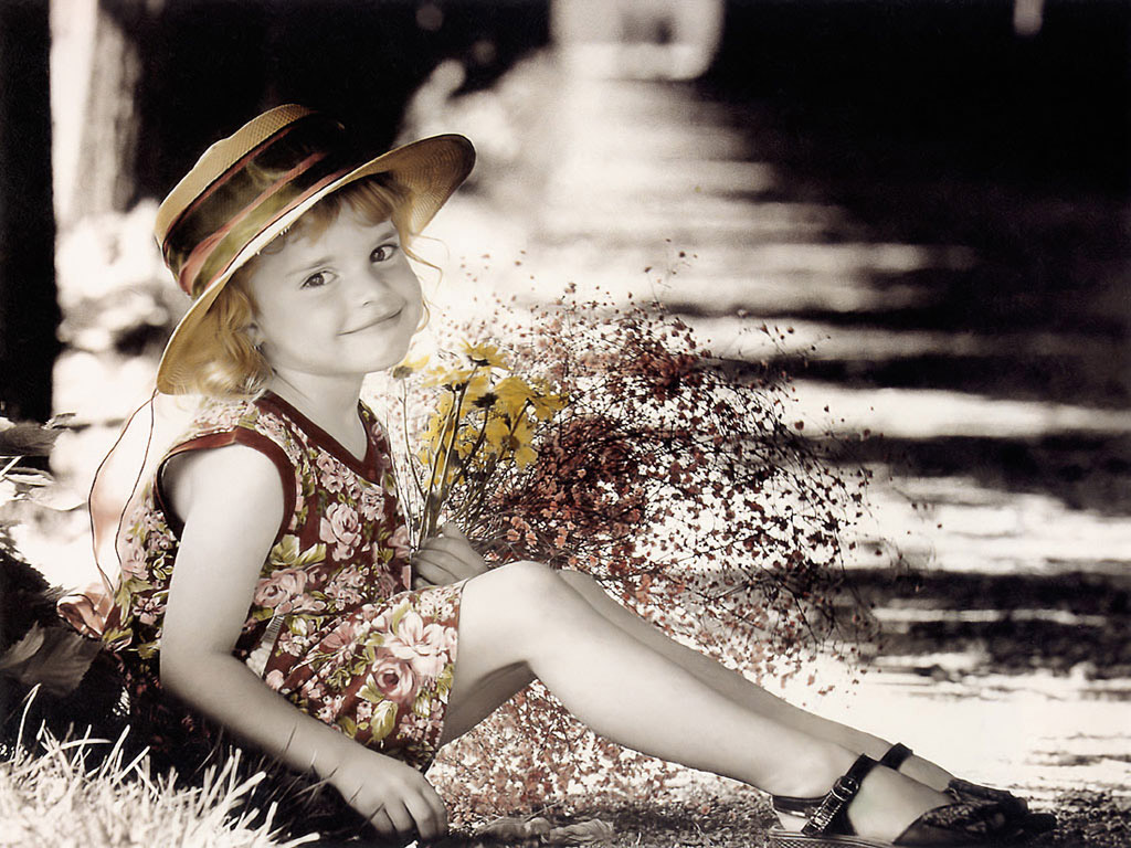 Description: A little girl sitting on the ground with a hat on her head and a bouquet of flowers in her hand.