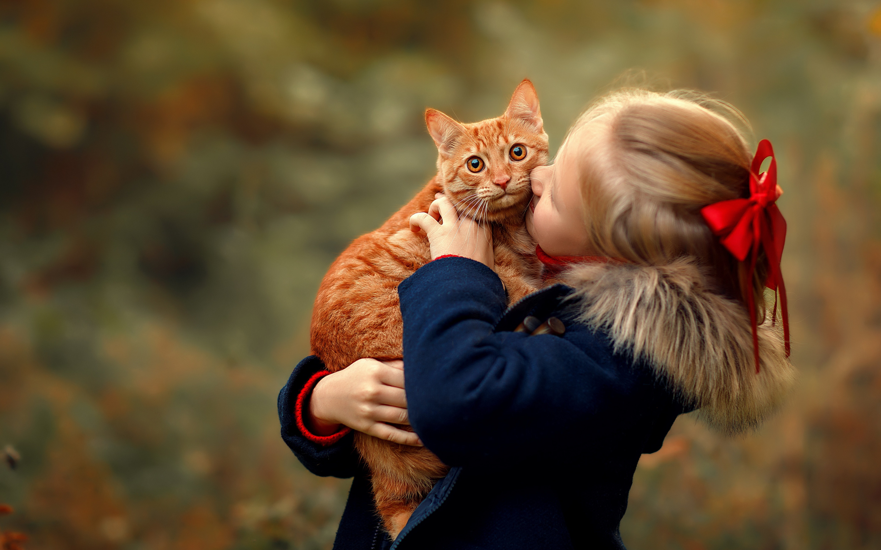 Description: A little girl is kissing a cat with a red bow on her head and a red bow on her neck.