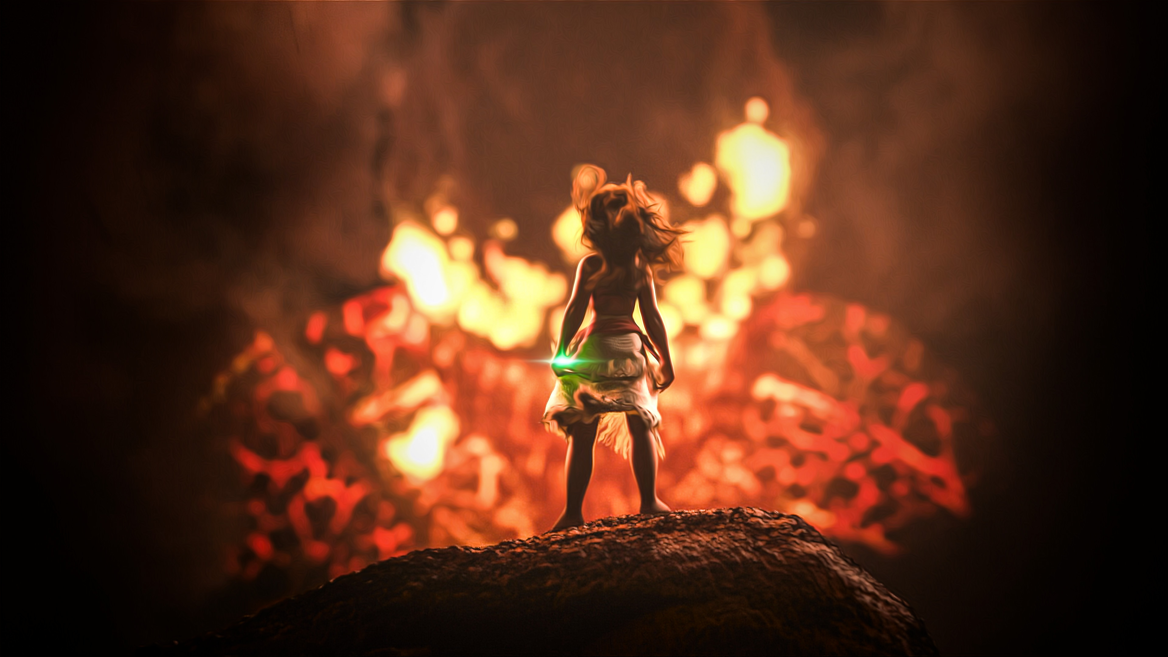 Description: A little girl standing on top of a rock in front of a fire filled forest of flames and lava.
