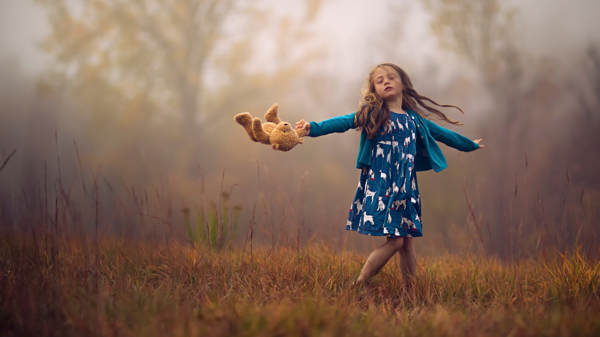 Description: A little girl holding a teddy bear in a field of grass and trees in the background.