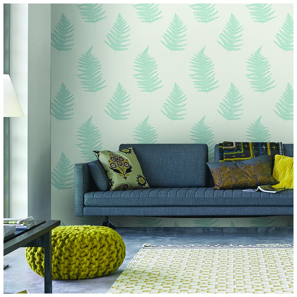 Description: A living room with a blue couch and a green rug on the floor and a wall with a pattern of leaves.